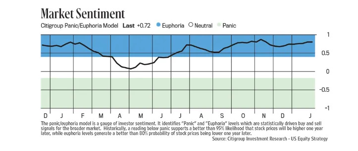 It normally includes Citi’s Panic/Euphoria Index which fell almost to the zero line at the end of April, moved higher, softened again in August but never left Euphoria before hitting new 52-week highs six weeks ago before again softening mid-Nov to mid-Dec but again climbing back towards the highs remaining well into Euphoria.