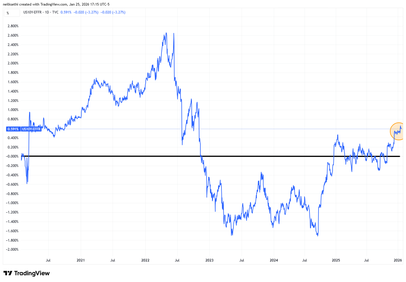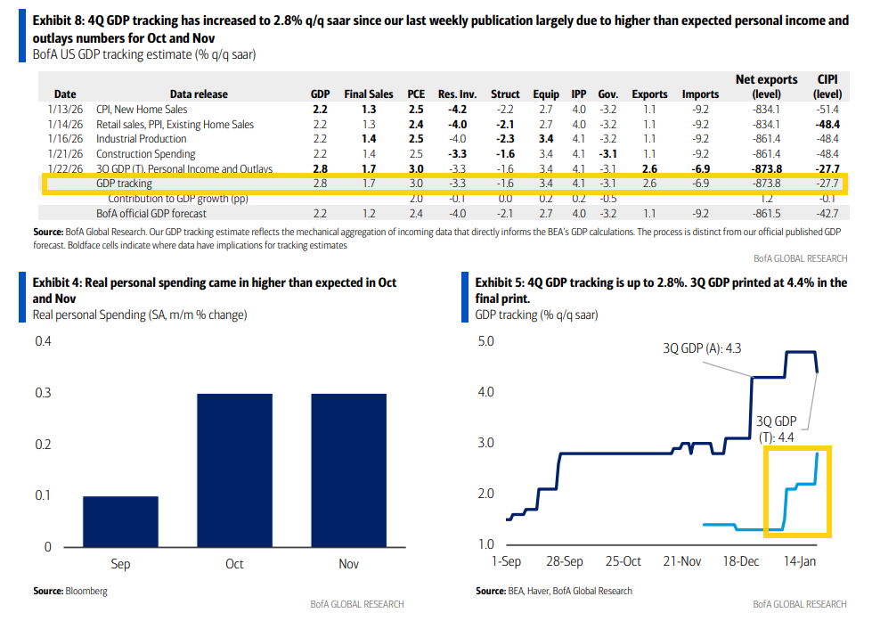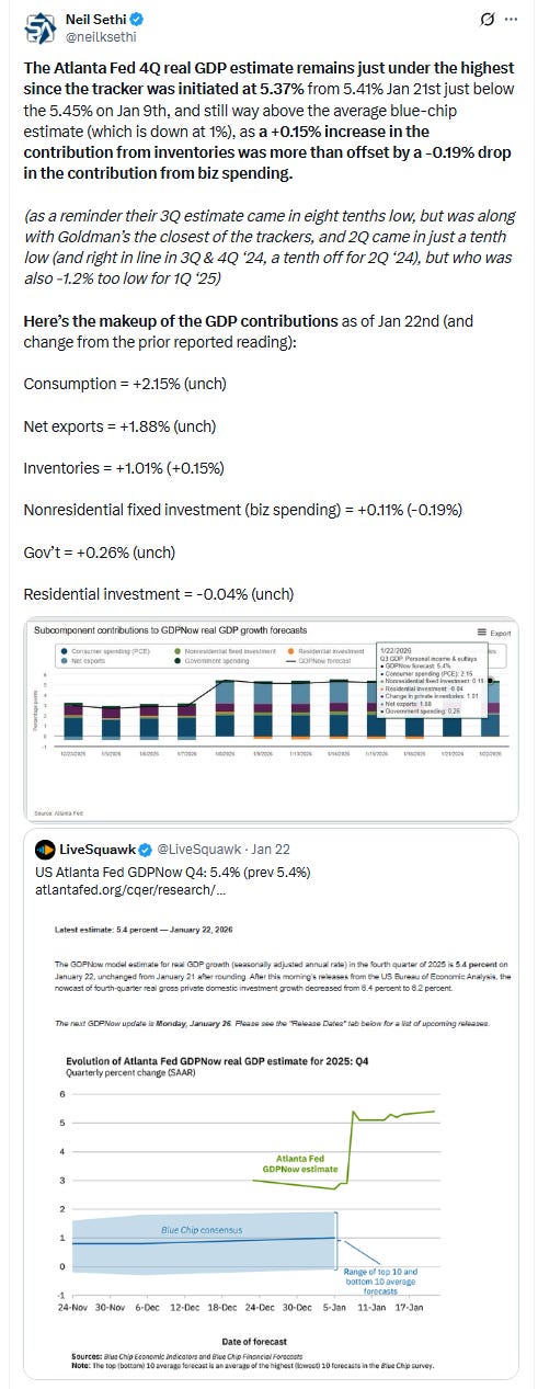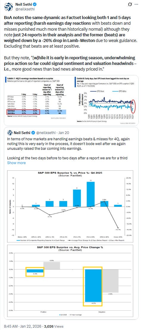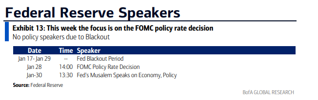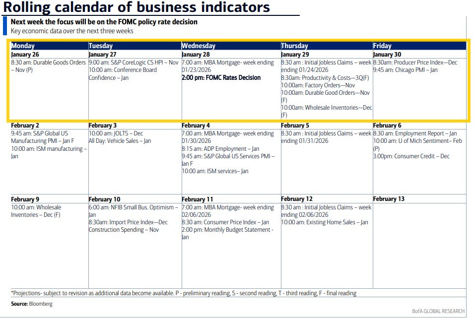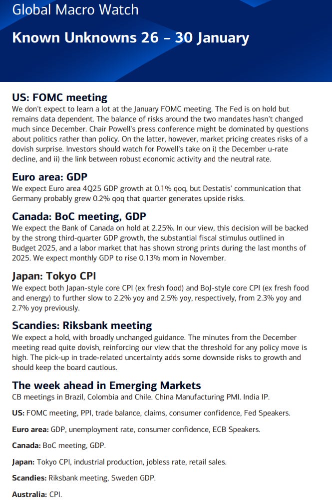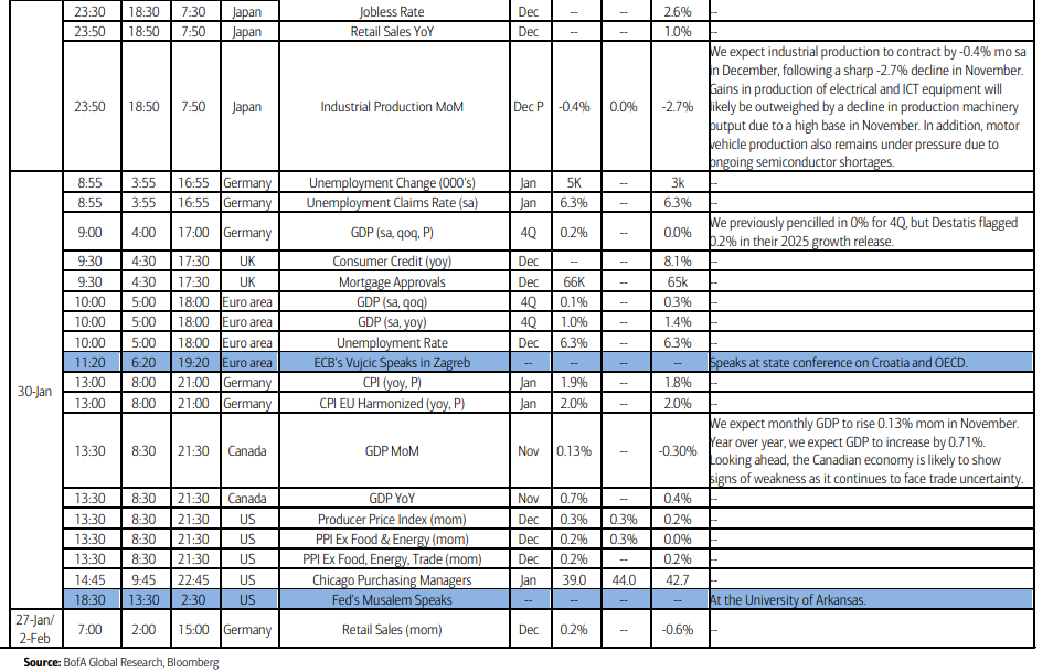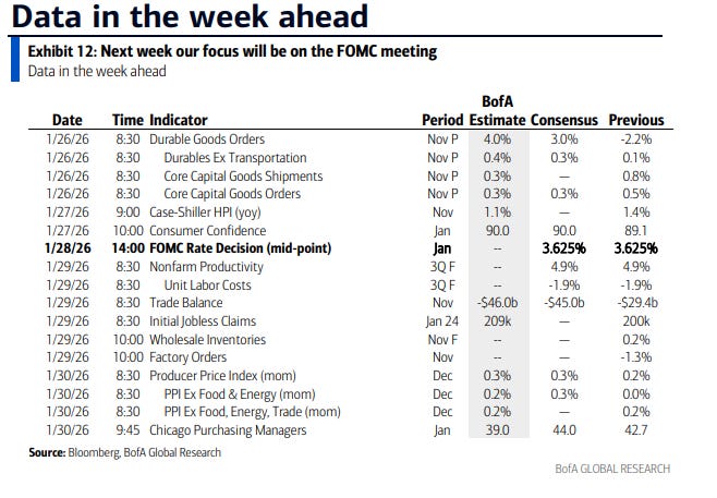 More importantly, the Fed kicks back into the spotlight with the Jan FOMC decision, although this will be the least exciting (if you’re interested in the path of interest rates) since last summer with a hold a lock, no updated SEP or dot plot, and Jerome Powell likely to get as many questions about Trump, his future, Fed independence, etc., as he is about the economy and monetary policy.