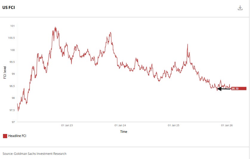 Goldman’s US Financial Conditions Index fell last week to the least (loosest) since October which in turn was the least since April 2022.