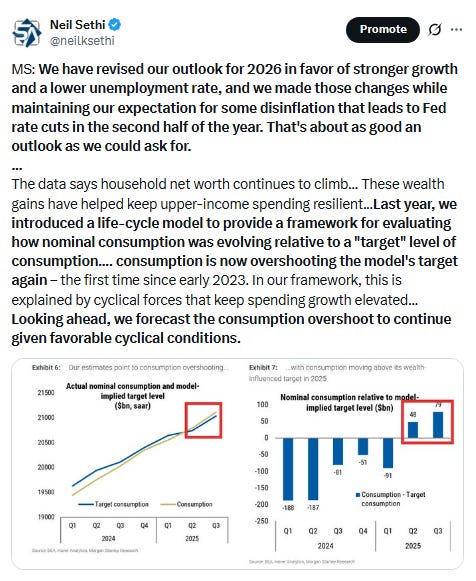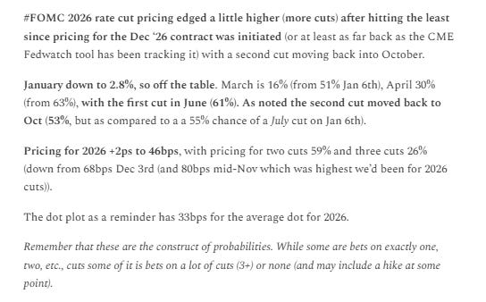 And JPM added that gives you 2026 voters. I have some quibbles. The ends are fair but there really should be a distinction b/w Miran and the rest. No way is Barr dovish (and he proved that with a speech not long after I first wrote that). He’s now proven himself to be with the Bostic/Kashkari Fed Presidents. Also, not sure about Cook (she seems to vote with Powell). I think Paulson though should be with Williams and Daly (and she proved that with a speech on Dec 12th. Collins was fairly hawkish in her last appearance as has been Goolsbee (although he’s tricky, dissenting from the Dec cut but also saying “I’m one of the most optimistic folks about how rates can go down in the coming year.”). Otherwise hard to argue much with the slotting.