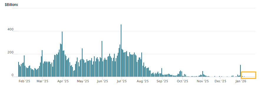 In line with my expectations, after moving higher into year-end (as banks “painted their books” for regulatory purposes), they have truly fallen to effectively zero (under $1bn), in line with the Fed’s desire to keep them at minimal levels (which led to the Fed having to start the reserve management purchases), so I will likely pause reporting on them unless/until they become noteworthy again.