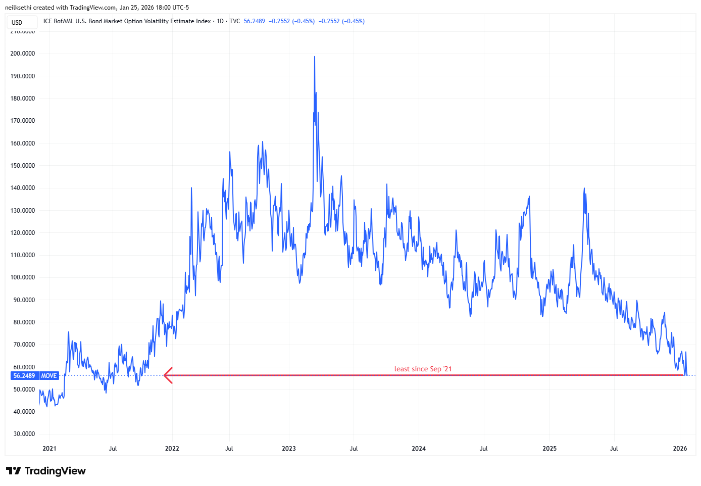 The MOVE index of expected 30-day Treasury note/bond volatility fell to 56.24 on Friday, just a touch above the 56.14 on Jan 16th, which was the least since Sept ‘21.