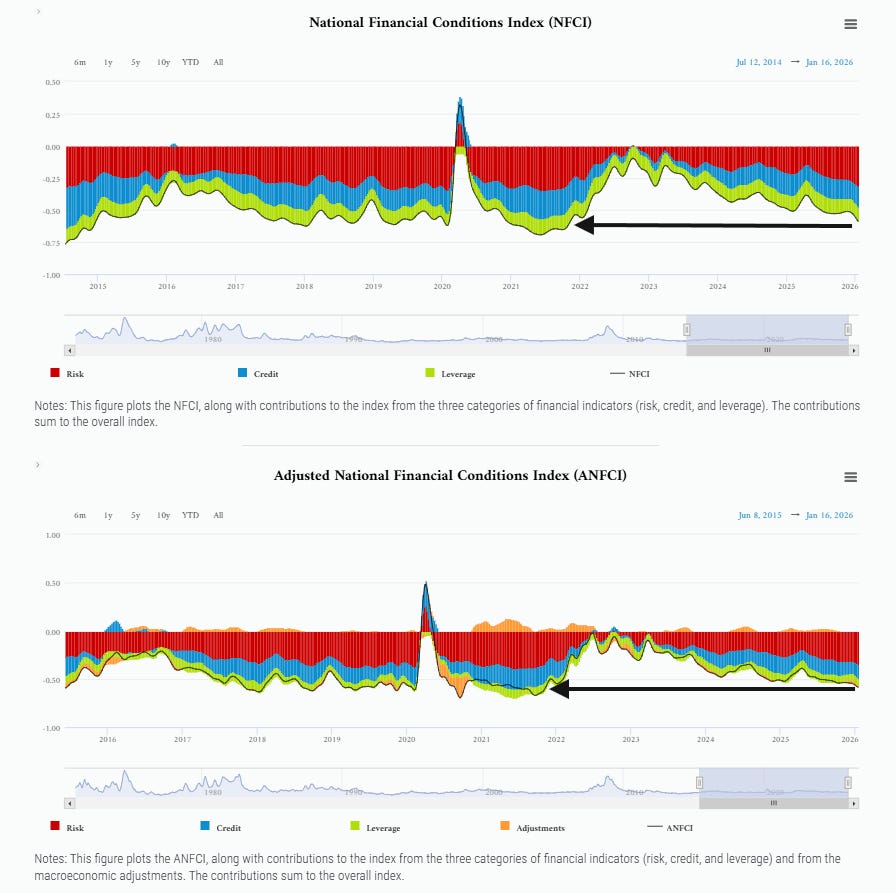 The Chicago Fed National Financial Conditions Index* and its adjusted counterpart took another step down (looser) to the least (loosest) since Nov ‘21 in the week through Jan 16th.