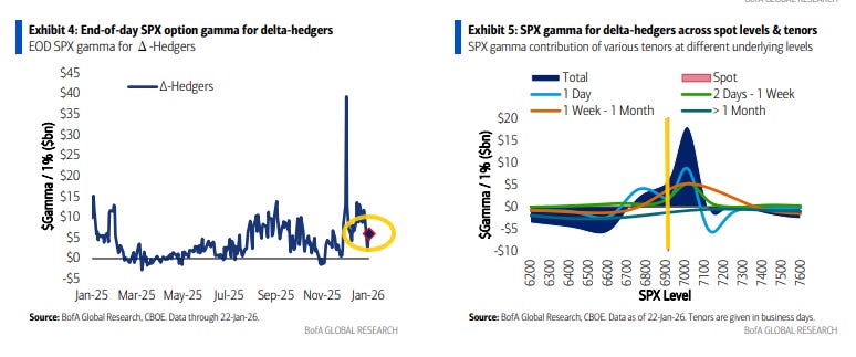 So unlike some others, BoA sees gamma as ending the week at a relatively high level (at least as compared with the past year which has been relatively low), which should provide some cushion to volatility, although as they note it falls off quickly to the downside, turning negative at the 6700 level (where dealers have to “chase” moves), so like Tier1Alpha seeing volatility growing with downside moves and increasingly softening with upside moves to the 7100 level (which is an interesting spot as Tier1Alpha says the JEPI call strike is 7155, so perhaps BoA disagrees).