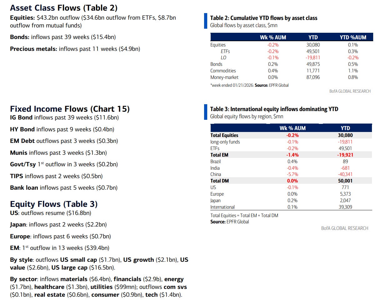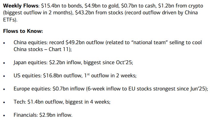 The drop was “on big outflows from equity/EM ETFs, a dip in global stock index breadth, [offsetting] bullish positioning in BofA FMS (e.g. cash level at record low 3.2%)”.
