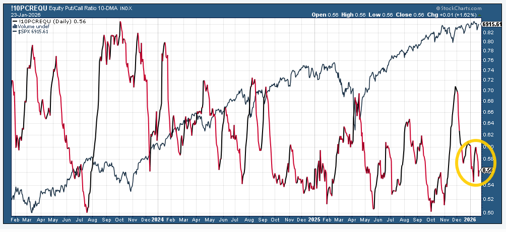 The 10-DMA of the equity put/call ratio (black/red line) fell back towards the lows of the year (0.55) at 0.56 from to 0.60 the prior week (meaning more upside protection (calls) being bought), which was the highs of the year.