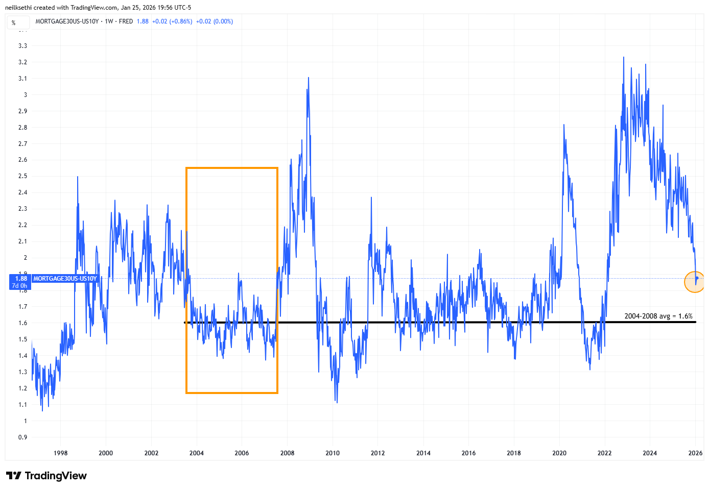 Still, they remain well under the peaks from the 2010-2019 period but still have some room (~23bps) for them to fall to get to the 2004-2008 avg level of ~1.6% (I use that period as it was like now a period of higher yields than post-GFC and also a period when the Fed wasn’t buying MBS and we had a more robust private market pre-2004 although with Fannie/Freddie maxing out their MBS purchases we very well might fall right through that). It also happens to coincide with the pre-pandemic 10-year average as well despite the distortions from Fed purchases, etc.