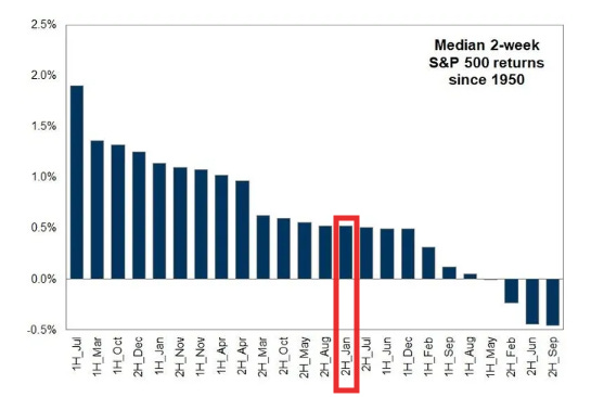 As we move into the second half of January, seasonality for all years since 1950 turns less supportive but still positive with a median return of +0.5% a little below the median for all periods.
