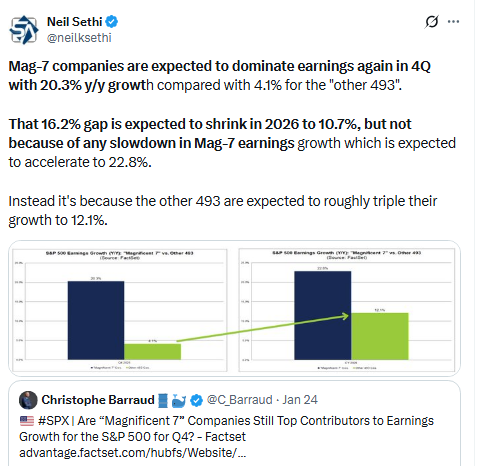 This week is a big week though with earnings from 32% of the SPX (by earnings weight) including five of the Mag-7. Major disappointment (which I don’t expect, actually the opposite) would be problematic at the index level (even if it might actually lead to move broadening). We also have the Fed (who also does not seem to be likely to provide a negative surprise) and Washington (who seems to be a never-ending source of drama that thankfully the markets have looked through focusing on what’s important - the economy and earnings). Hopefully that all continues.