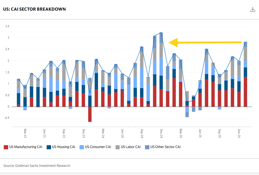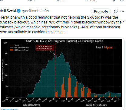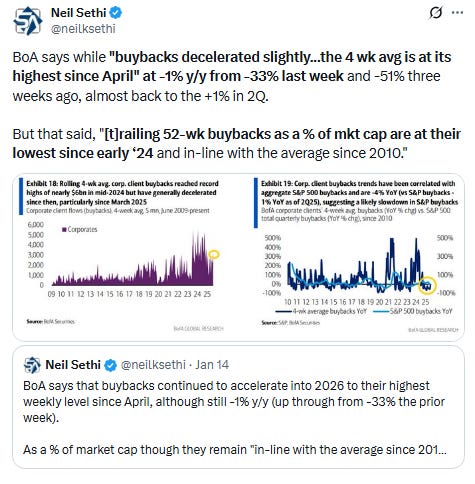 And after buybacks ended 2024 at record levels and started 2025 even better, they had by and large remained below seasonal averages from April until October when they seemed to have picked back up (depending on who you ask), but according to BoA and Goldman they accelerated into year-end and have continued to run at record levels on a nominal basis in 2026, although that is still just in line with the average since 2010 on a market cap weighted basis We are now starting to exit the buyback blackout window which will allow discretionary buybacks (~30% of all buybacks) to recommence.
