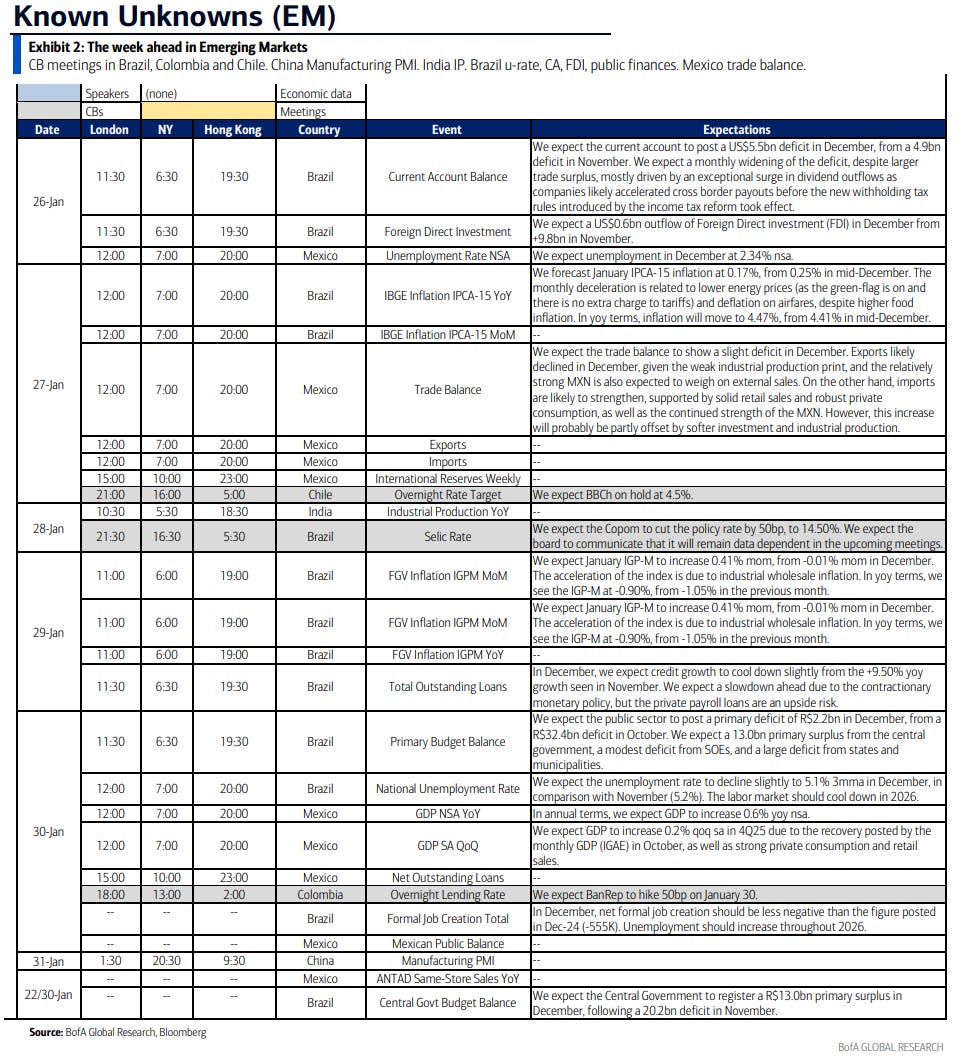 In Mexico, fourth-quarter output data more likely than not will show LatAm’s No. 2 economy dodged a technical recession after posting twin negative prints for the three months through September. External headwinds, especially the wild cards surrounding US trade policy and the review of the free trade accord with the US and Canada, weigh on the outlook for 2026. Colombia’s central bank on Friday is all but certain to waste no time responding to a 23% hike to the minimum wage. Analysts see a half-point rate increase to 9.75%, with 125bps to 150bps more tightening by year-end as 2026 inflation expectations have surged to 6.37% from 4.59% last month.