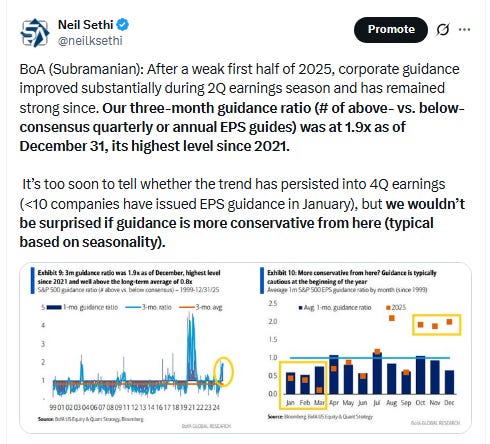 The longer term story remains a positive one. The Fed is engaged in a cutting cycle in what does not appear to be a recession (which has almost always resulted in market gains), earnings growth has been strong with revisions very positive (although we might be seeing some cracks in that), we will continue to get more fiscal tailwinds from the OBBBA as we move deeper into 2026 (as noted in the Economy section), the economy remains healthy with some evidence of acceleration, corporate buybacks remain solid on pace for a record year (and we’re exiting the discretionary buyback blackout), and retail continues to want to buy the dip (and it seems perhaps now hedge funds as well). It’s when we start to see a majority of those flip that I’ll be more concerned.