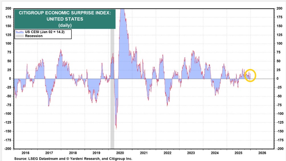After falling back into negative territory for the first time since July two weeks ago, the Citi Economic Surprise Index improved for a second week to +14.2, still though down from the +21.8 three weeks ago, which had been the highest since Sept.