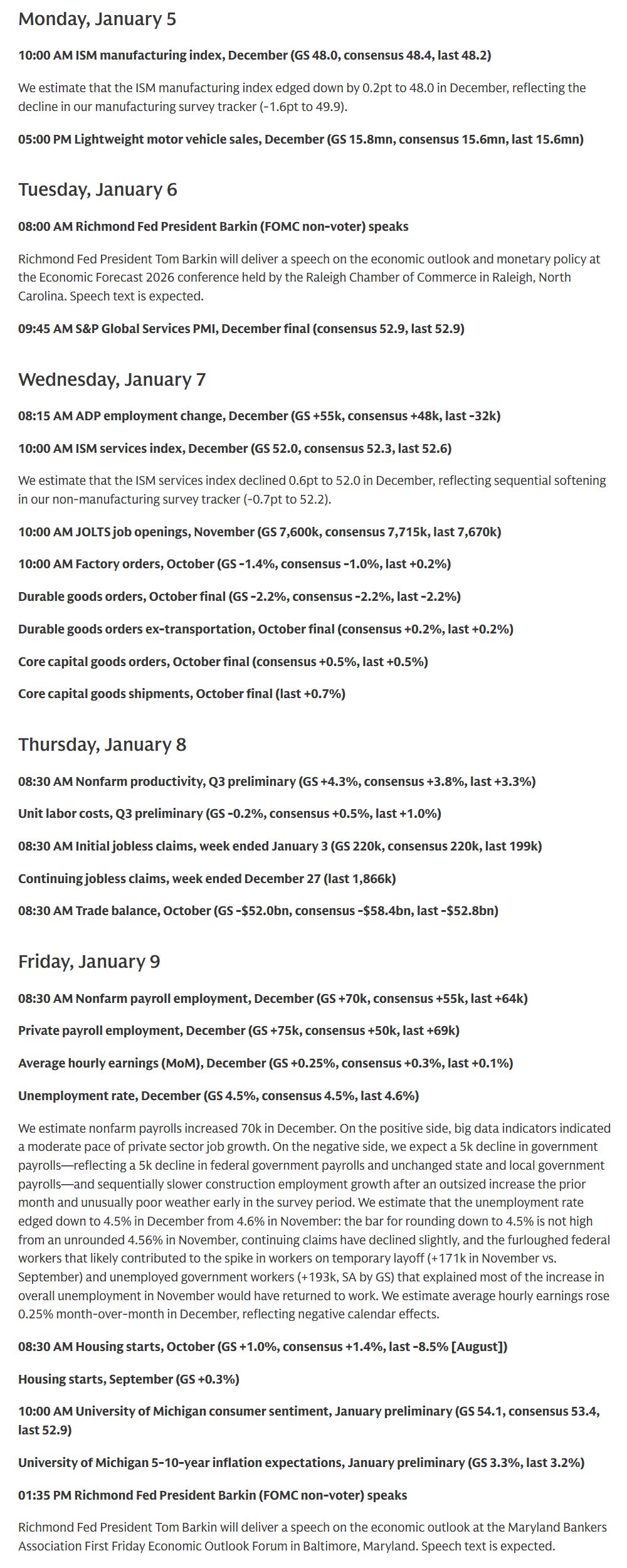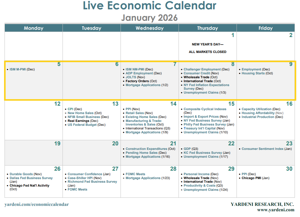 We’ll jump into 2026 with both feet this week as we get our normal first week of the month reports with a focus on the labor market and a return to “jobs Friday”. But as usual, before we get there, we’ll get Dec ADP (does small biz hiring bounce back after worst read ex-pandemic in 15 years?) and Challenger job layoff/hiring announcements (Thurs), Nov JOLTS, and weekly jobless claims. And, as usual, we’ll get the Dec ISM PMIs (and S&P final services), auto sales, and as we often get the first week, reports on the trade deficit and factory orders, but for Oct (so a month late).