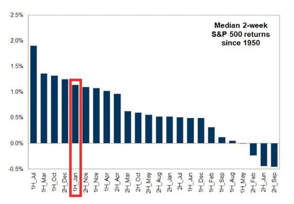 Looking since 1929 the first half of Jan is similarly relatively strong with an average gain +0.72%, the 5th best of all half-months and well above the all-halves average of +0.25%, and the median an even better +1.12% which is 3rd best also well above the all-halves median of +0.59%.