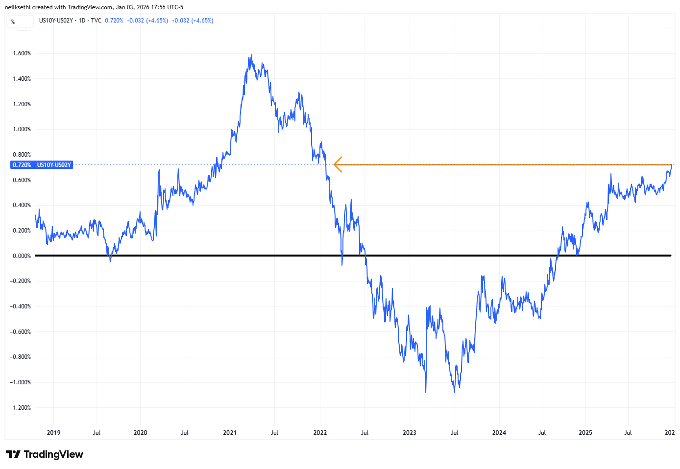 The 2/10 Treasury spread pushed up to +0.72% on Friday, the highest since Jan ‘22.