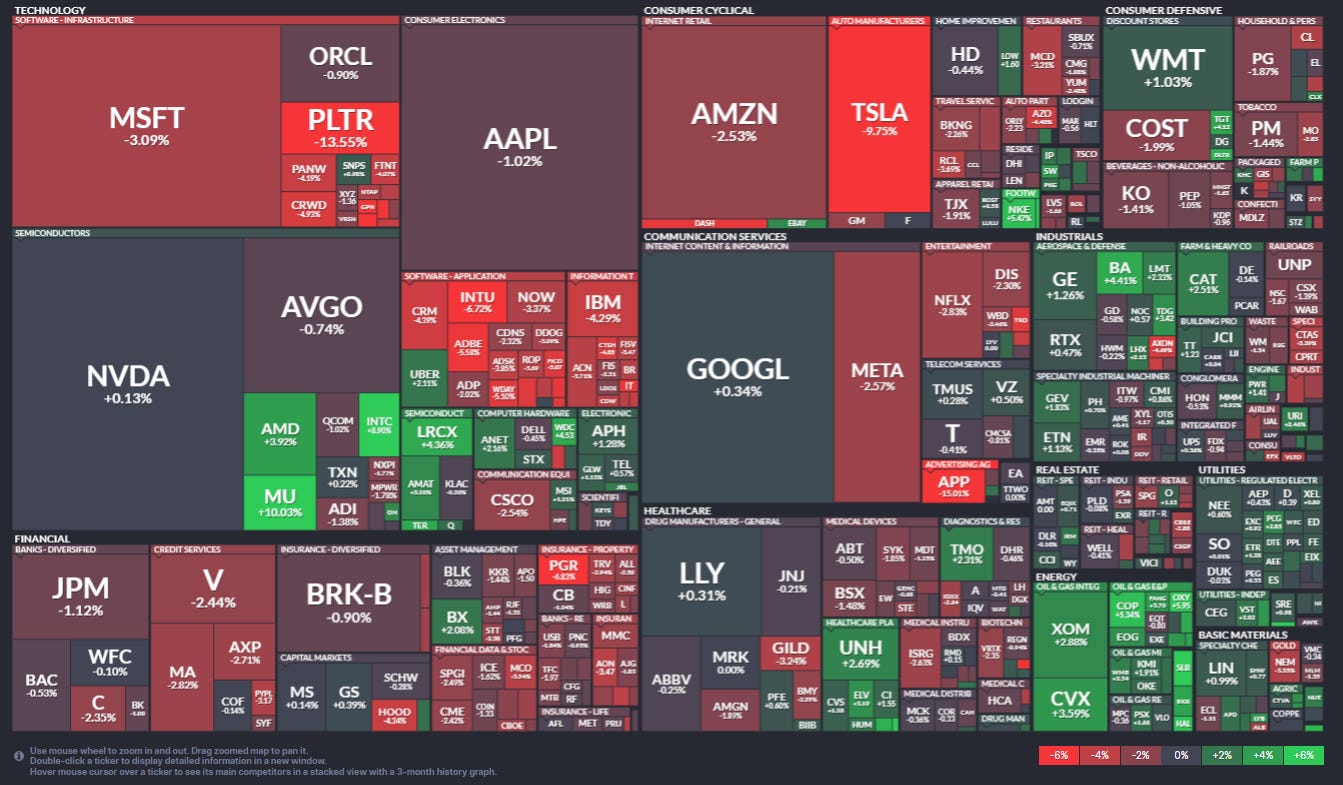 Stock-by-stock chart from @FINVIZ_com is for the last 5 trading days so includes the previous Friday but is broadly consistent with a lot of weakness in Financials, Tech (concentrated in software) and Cons Discr (concentrated in TSLA but a lot of other big names down over -2% including AMZN, BKNG, and MCD.