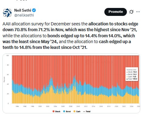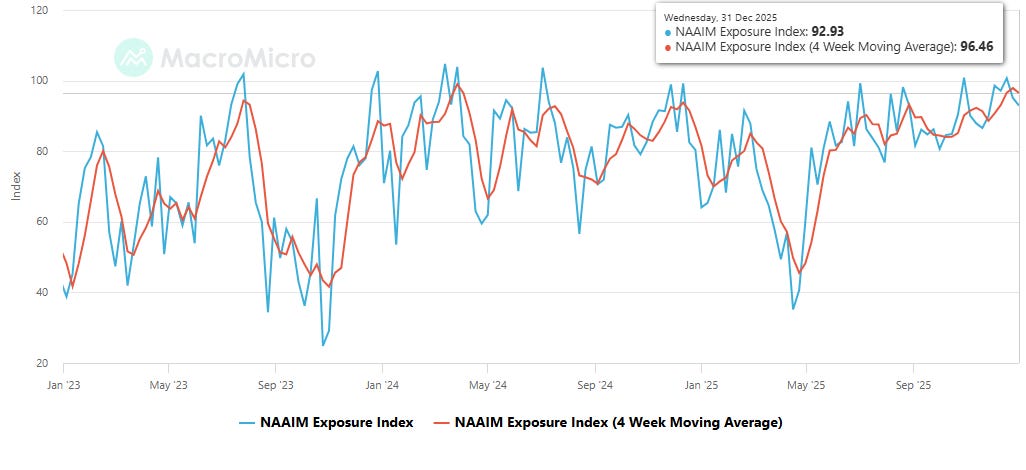 NAAIM (investment managers) exposure index (blue line) edged down for a second week after exceeding the 100 mark for the second time this year two weeks ago (which means that the average respondent (investment manager) is levered long equities), down to 92.93% from that 100.70% reading which was just a touch under the 100.83% Oct 29th, which was the highest since July ‘24.