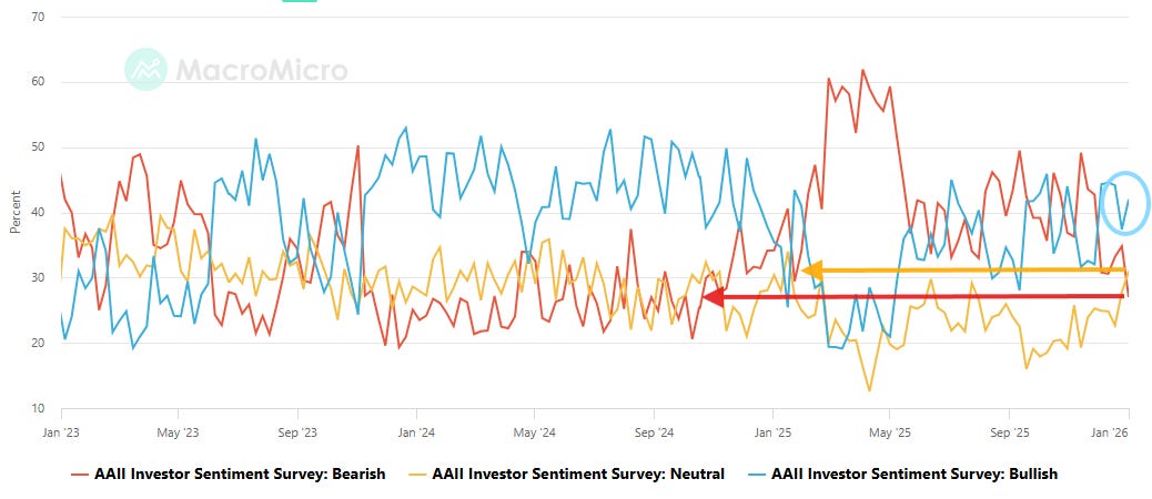 So most of those bears bulls went into the neutral camp (yellow line) which shot to 31.0%, the highest since Jan, from 27.8% the prior week, but still juuust under the long-run average of 31.5% for the 75th week in 77 (since July ‘24).