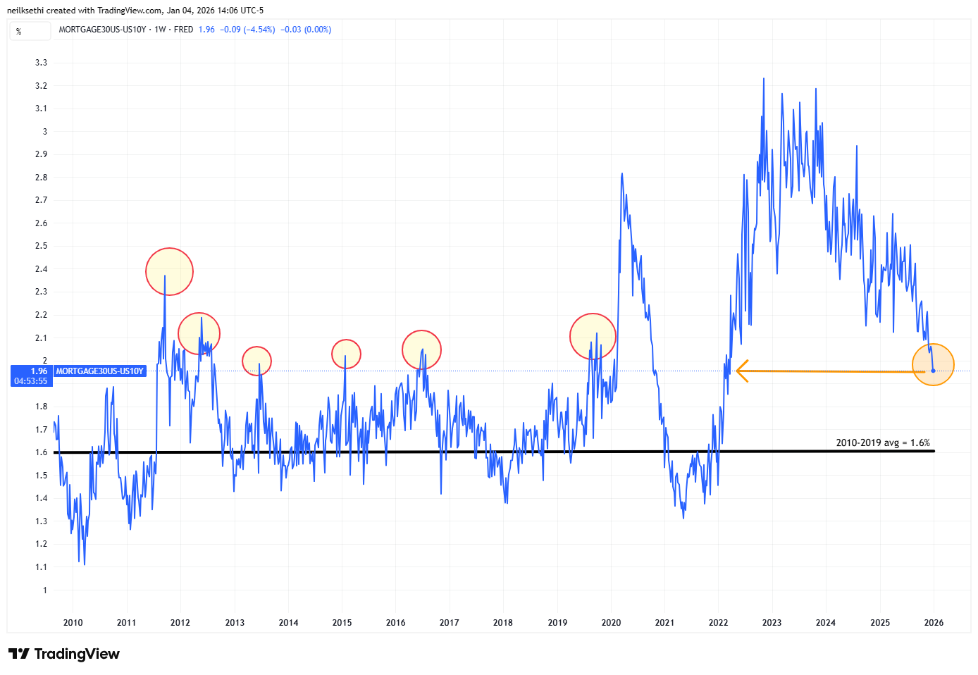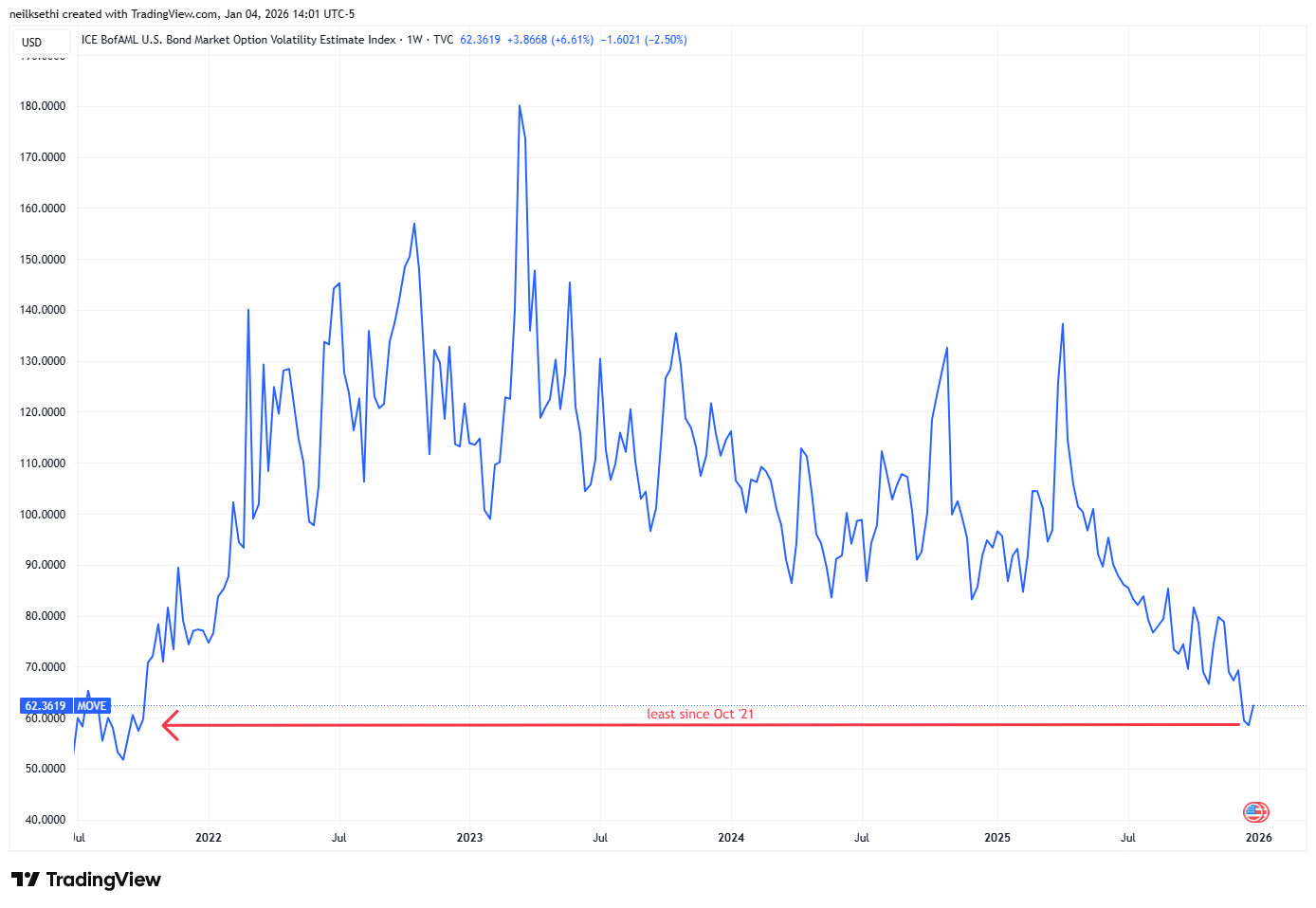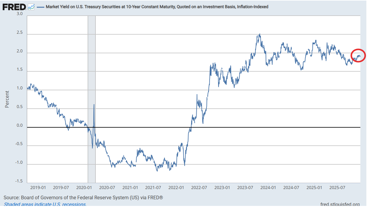 So “[o]verall the 10yr yield continues to hold the bottom of of my 2025 likely trading range of between 4 and 5%. It’s broken that level a few times, but it’s held each time outside of a [few days]. We’ll see if that level can continue hold and/or if yields can get any traction to the upside or downside.” As noted last week I am thinking for 2026 the range will likely be closer to 3.5 to 4.5% (with risk to the downside if the labor market continues to weaken).