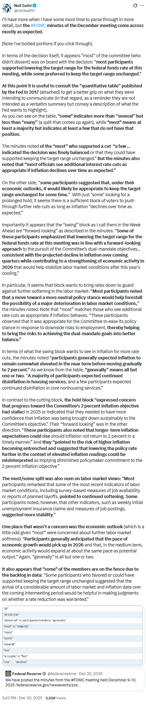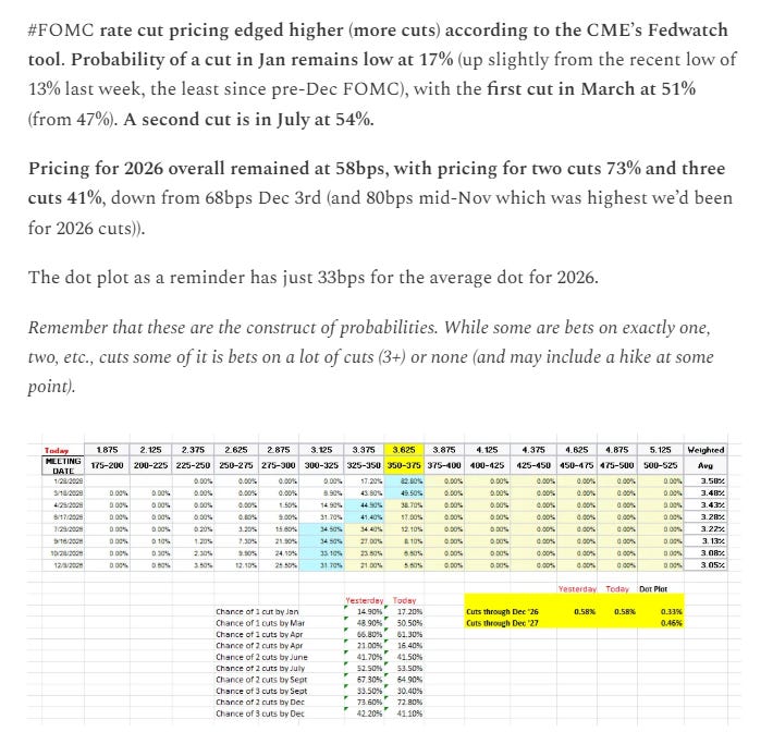 And JPM added that gives you 2026 voters. I have some quibbles. The ends are fair but there really should be a distinction b/w Miran and the rest. No way is Barr dovish (and he proved that with a speech not long after I first wrote that). He’s now proven himself to be with the Bostic/Kashkari Fed Presidents. Also, not sure about Cook (she seems to vote with Powell). I think Paulson though should be with Williams and Daly (and she proved that with a speech on Dec 12th. Collins was fairly hawkish in her last appearance as has been Goolsbee (although he’s tricky, dissenting from the Dec cut but also saying “I’m one of the most optimistic folks about how rates can go down in the coming year.”). Otherwise hard to argue much with the slotting.