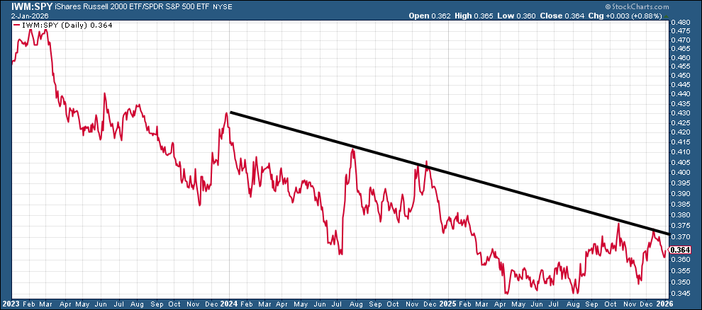 IWM:SPY (small caps to large caps) also little changed after being turned away from its downtrend line from the start of 2024 two weeks ago.