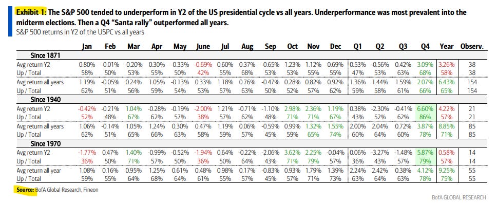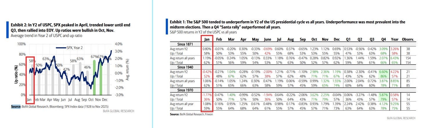 And looking specifically at Year 2 of the Presidential cycle, January has been up 58% of the time with an average gain of 0.80% (vs 62% and 1.19% for all year), but if we zoom in on since 1970, it’s up just 36% of the time with an average loss of -1.77% (vs 59% and 1.08% for all years).