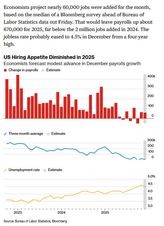 But we’ll also get some reports we don’t normally get the first week as the shutdown delayed 3Q productivity report comes in (an important report given the Fed’s new focus on this subject as a reason rate cuts may be appropriate despite strong growth), and due the upcoming Friday being the second Friday of the month, we’ll also unusually for jobs week get a delayed Oct housing starts/permits report, Nov consumer credit, the Dec NY Fed consumer survey (Thurs), and the preliminary Jan UMich consumer sentiment survey, plus the normal weekly mortgage applications and EIA petroleum and natgas inventories reports. So lots of data to kick off 2026.