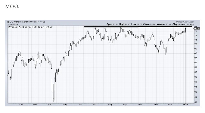 These lines may be moot by the time trading is underway on Monday so the only observation I have is that not much has changed in the charts in the two weeks I’ve been gone. Most charts are still ‘home on the range’. I have thrown a few new ones in like Tungsten (!!!) and have decided to keep XLB and MOO cuz they are on the cusp of breaking out.