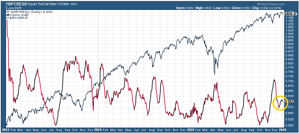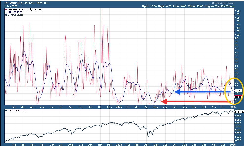 The 10-DMA (blue line) also moved lower for a third week. It’s at just 19, the least since June. The 2025 high was 40 in October (and the 2024 peak was 76).