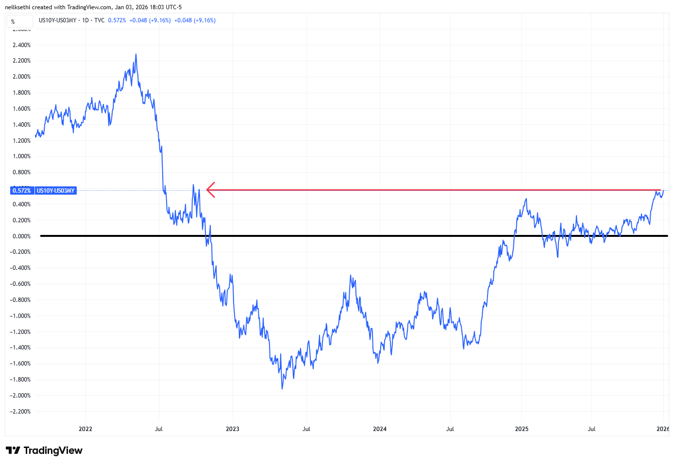 Note this curve is considered a better recession signal than 2/10’s w/the last four recessions on average coming a few months after the curve uninverted (prior to that it generally uninverted after a recession had already started)).