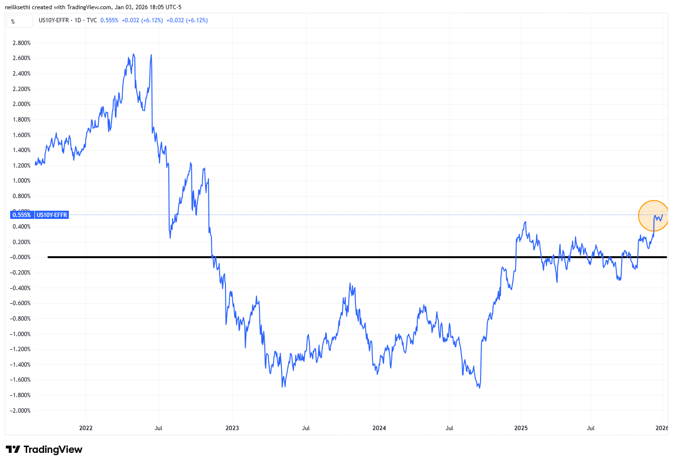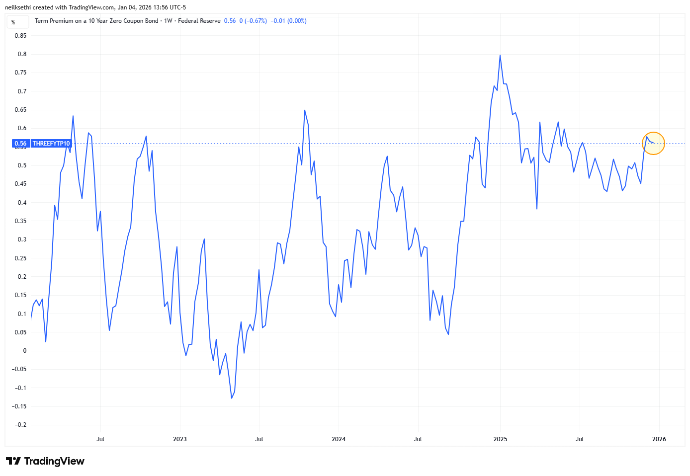 As mentioned above, the ACM model has a weakness in that it looks only at rates with no “anchor” to the external environment. The Kim-Wright model addresses that by adding in an expectations layer (from Blue Chip forecasters) of the expected path of short-term rates. TradingView has started carrying that, so I am going to likely switch over to that (or at least note both). Unlike the ACM model, the post-pandemic peak was in Jan at 0.80%, and the overall current level is lower at 0.56% (as of Dec 22nd). The overall message is similar though in that pre-pandemic you have to go back to 2013 to find comparable levels.