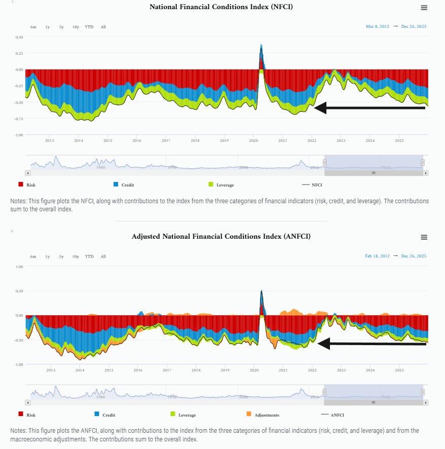 The Chicago Fed National Financial Conditions Index and its adjusted counterpart both fell to the least (loosest) since Nov ‘21 in the week through Dec 26th.