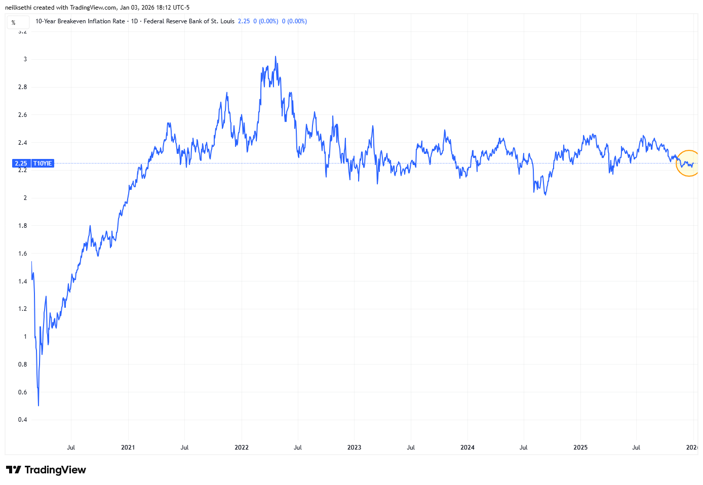 The 10-yr breakeven inflation rate edged back to 2.25% as of Friday, in its post-2022 range.