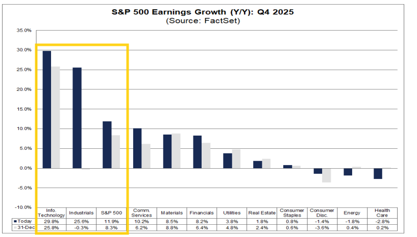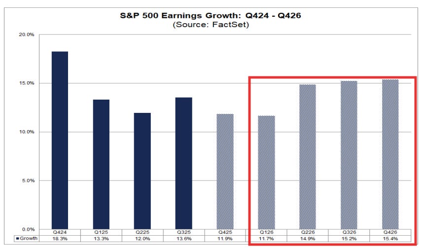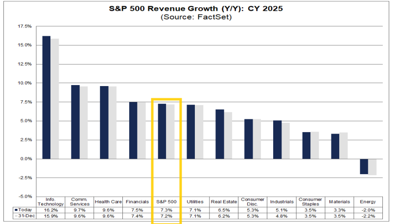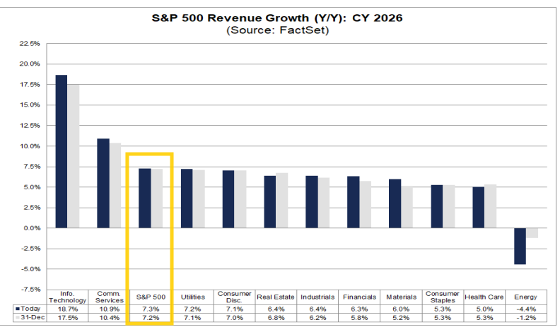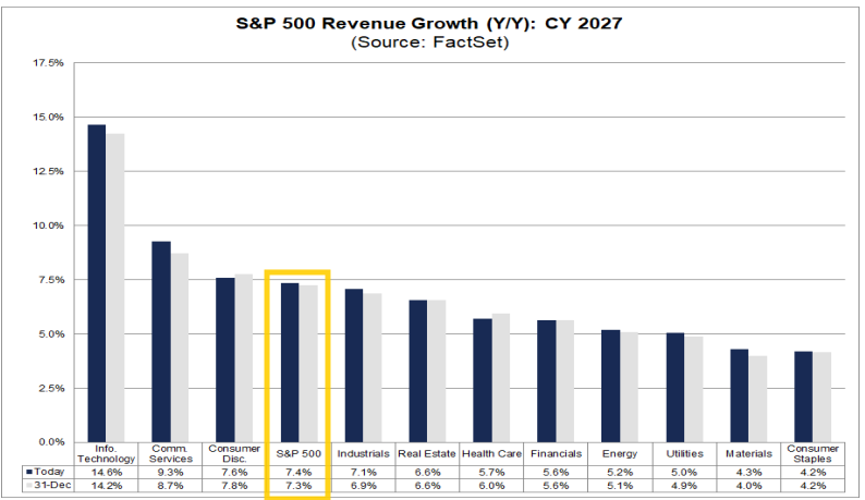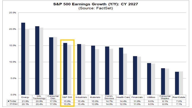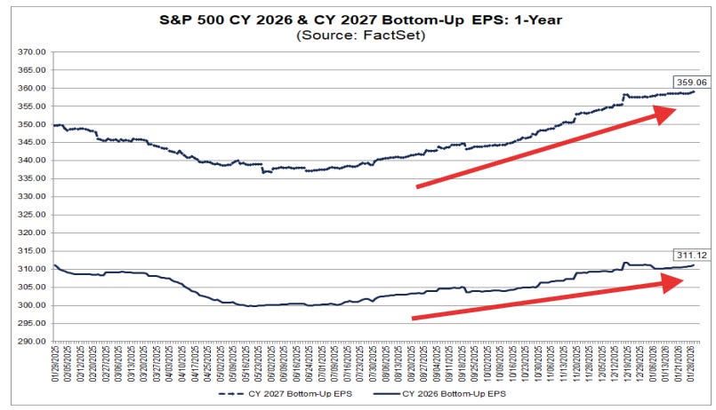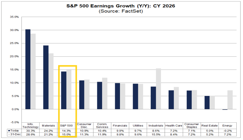 2026 earnings growth expectations remain at a very robust +14.3% although edging back -0.4% as the “base” (2025 earnings) moved notably higher this week). 2026 is again expected to be led by Tech at +30.3% (which is up +1% w/w despite the higher base). That would be the third year of double-digit growth earnings growth.