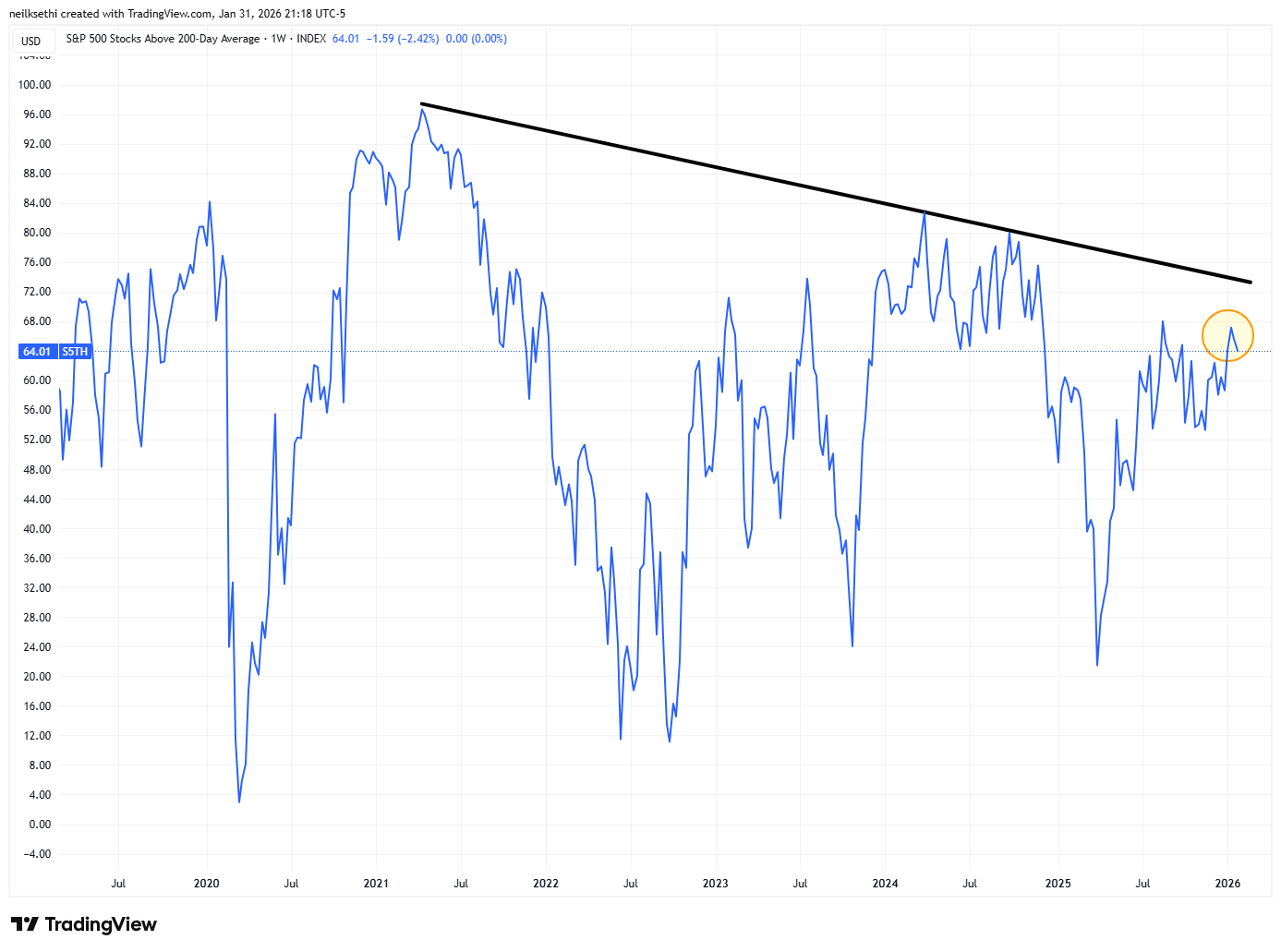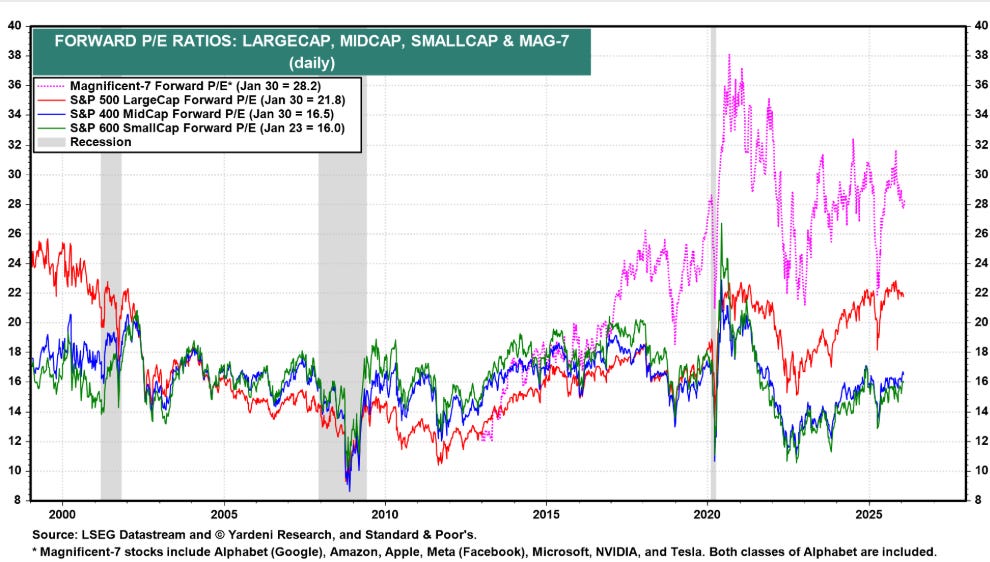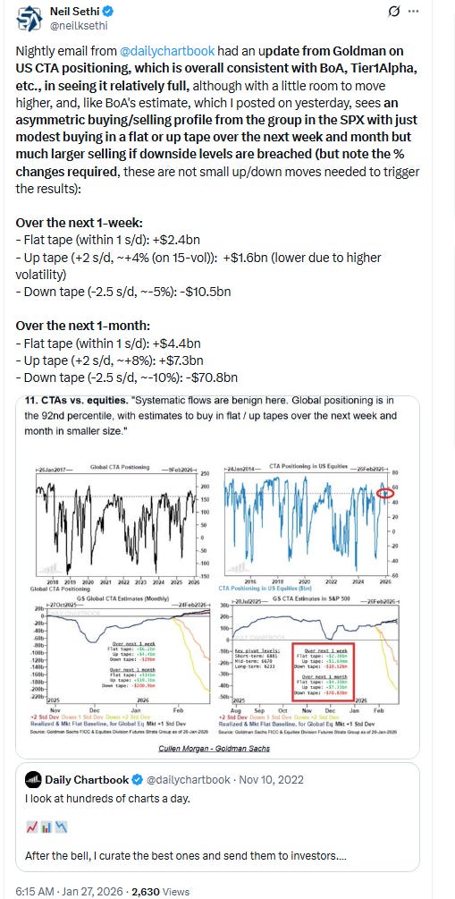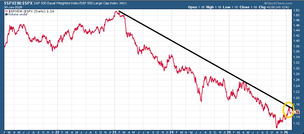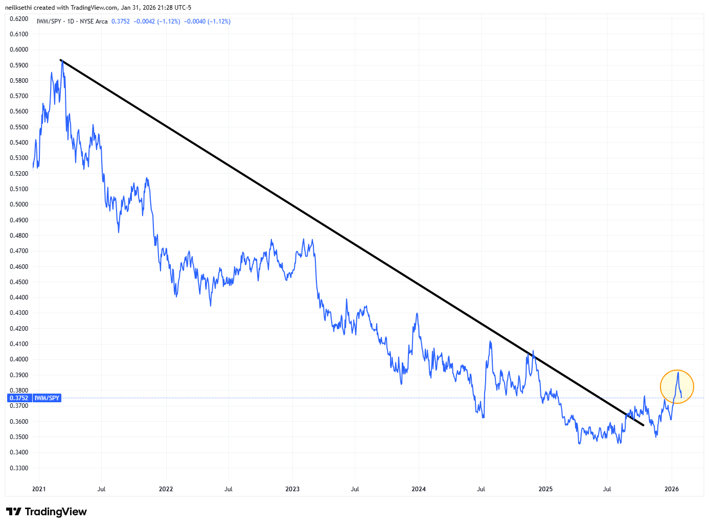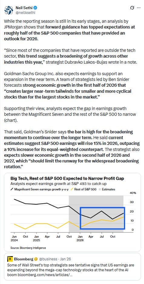 despite a start to the year that I think few envisioned (outside of the President’s inner circle perhaps) from the geopolitical (Maduro removal, potential Iran strikes, potential NATO tariffs, etc.) to the domestic (Fed rate cut bets slashed, a flurry of executive proposals from capping credit card rates to homebuyer assistance to attempts to limit certain buybacks and executive compensation, renewed government shutdown threats, etc.) markets have not only hung in remarkably well but have seen a dramatic broadening to the more sensitive areas of the market (cyclicals, small caps, etc.).