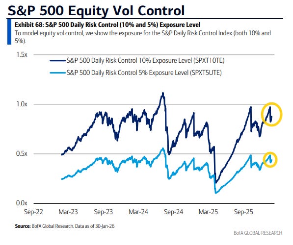 BoA models some buying last week by vol control funds (which they estimate at around $200bn of AUM) which saw their positioning edge up overall though not far from the 2025 peak.
