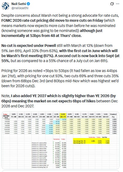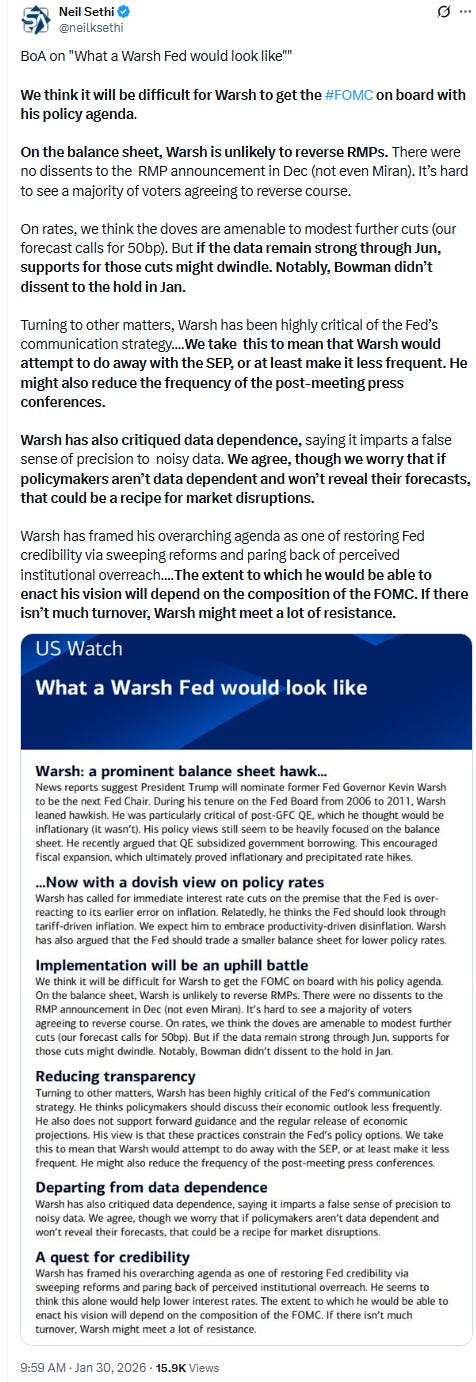 But all of that is now set to change to some extent with the introduction of a new character to the script in Fed Chair nominee Warsh. I’ll have more to say about Warsh as we get closer to him actually becoming a Governor (which doesn’t look to to be anytime soon given the standoff between Trump and key Senator Tom Tillis. With Trump not wanting to drop the criminal investigation into the Fed, and Tillis adamant he won’t advance Warsh’s nomination absent the investigation being “cleared up”, unless a Democratic Senator in the Banking Committee is willing to cross the aisle, this will drag on until one one gives in.