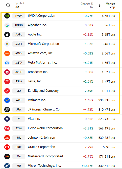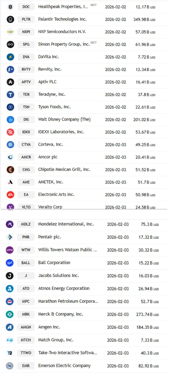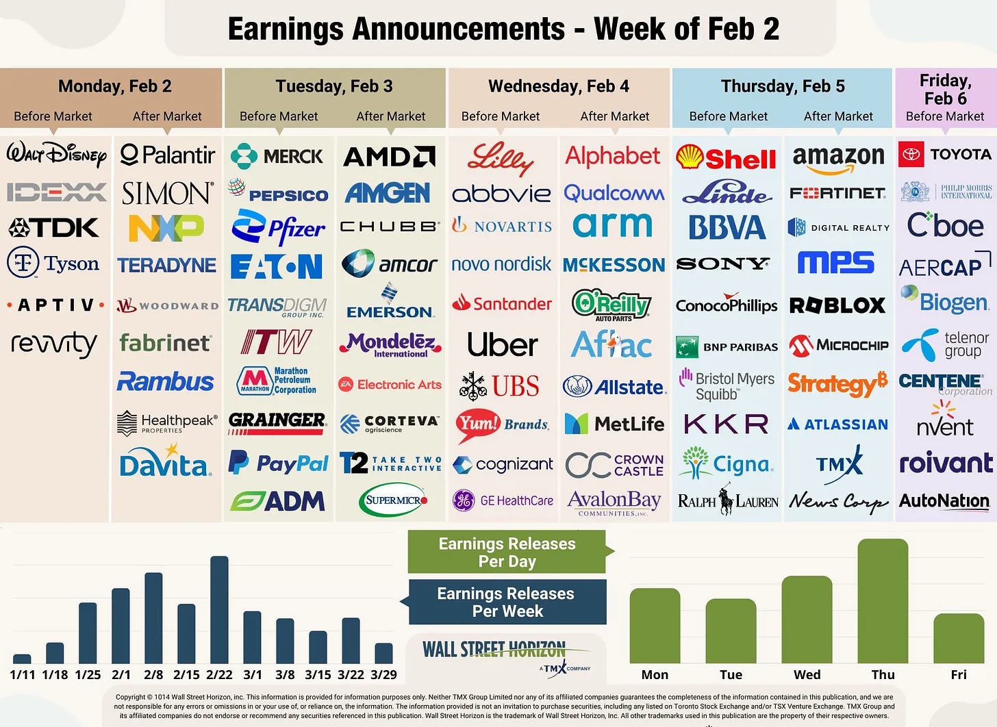 While we’re past the peak of SPX earnings, it’s still a huge week with 25% of the SPX by earnings weight reporting consisting of around 155 SPX components, with two more Mag-7s in GOOG & AMZN and another ~20 >$100bn in market cap in DIS, PLTR, AMGN, AMD, MRK, CB, PEP, ETN, PFE, BSX, CME, MCK, QCOM, ABBV, UBER, BMY, LIN, COP, KKR, PM (by reporting date). Full list below from TradingView.