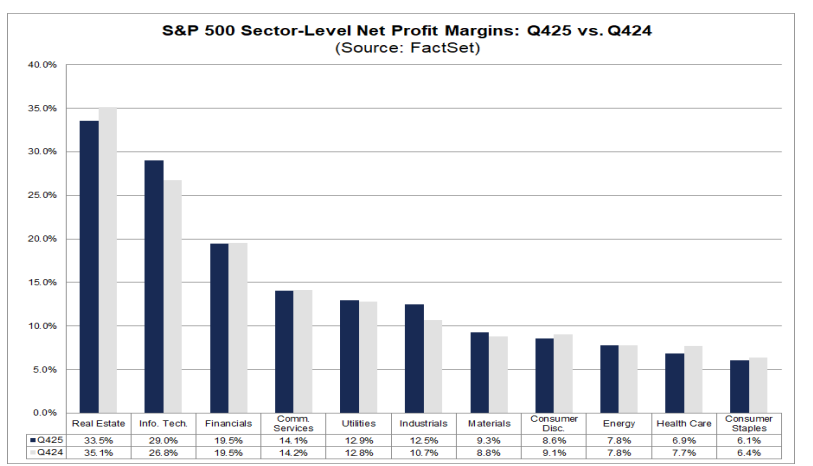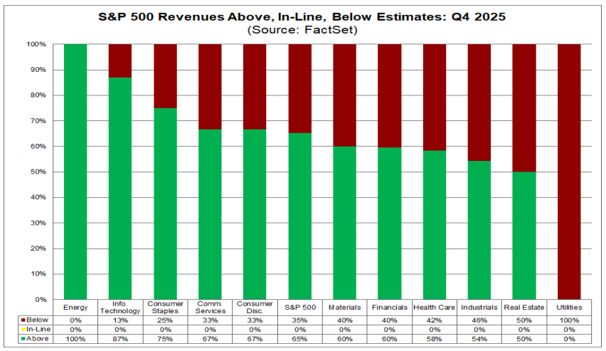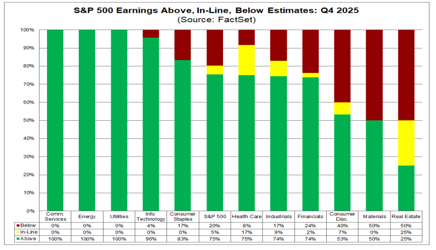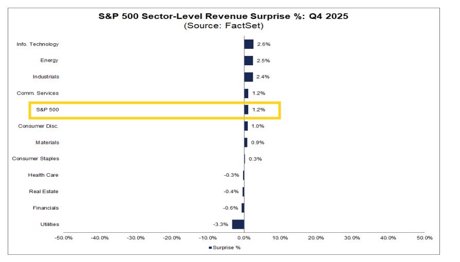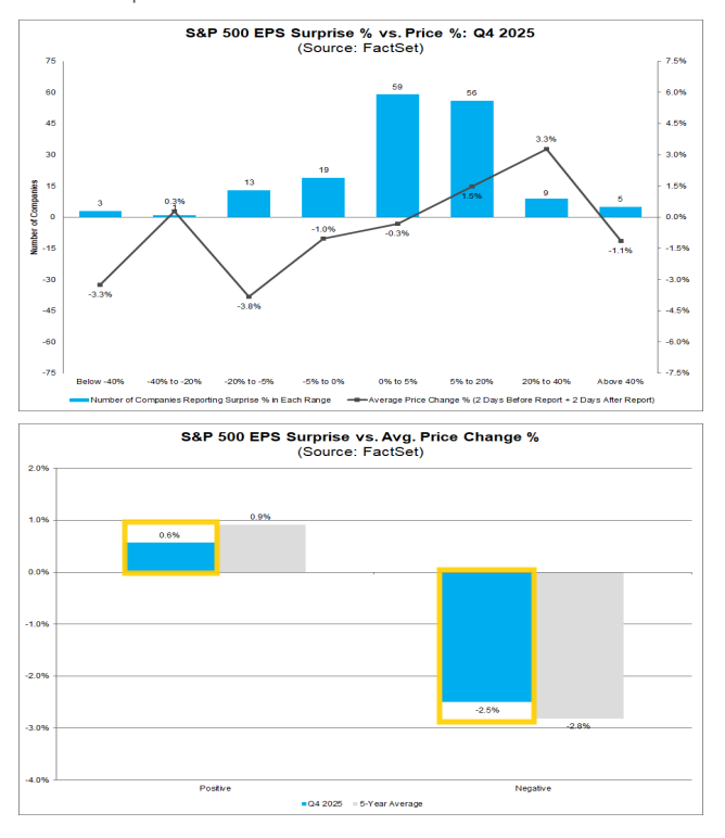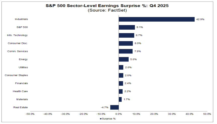 Leading the change is a massive 42.9% beat amount for the Industrials sector (the only sector above the SPX’s +9.1%), but note this is more due to accounting than performance: “Boeing ($9.92 vs. -$0.44) and GE Vernova ($13.48 vs. $2.93) have reported the largest positive EPS surprises. The actual EPS for Boeing included a $9.6 billion dollar gain on a sale connected with closing of the Digital Aviation Solutions transaction, while the actual EPS for GE Vernova included a $2.9 billion tax benefit due to a U.S. valuation allowance release.”