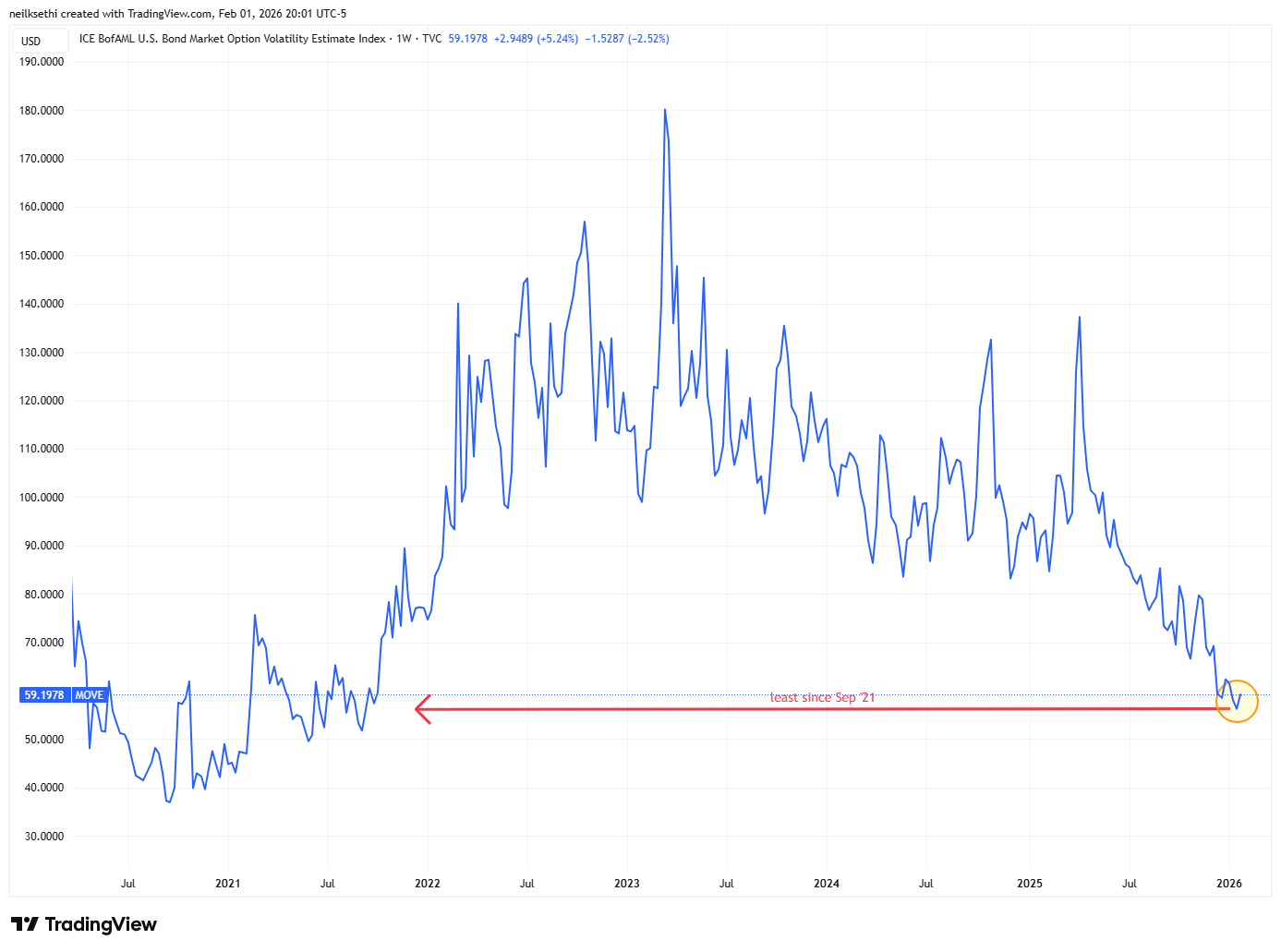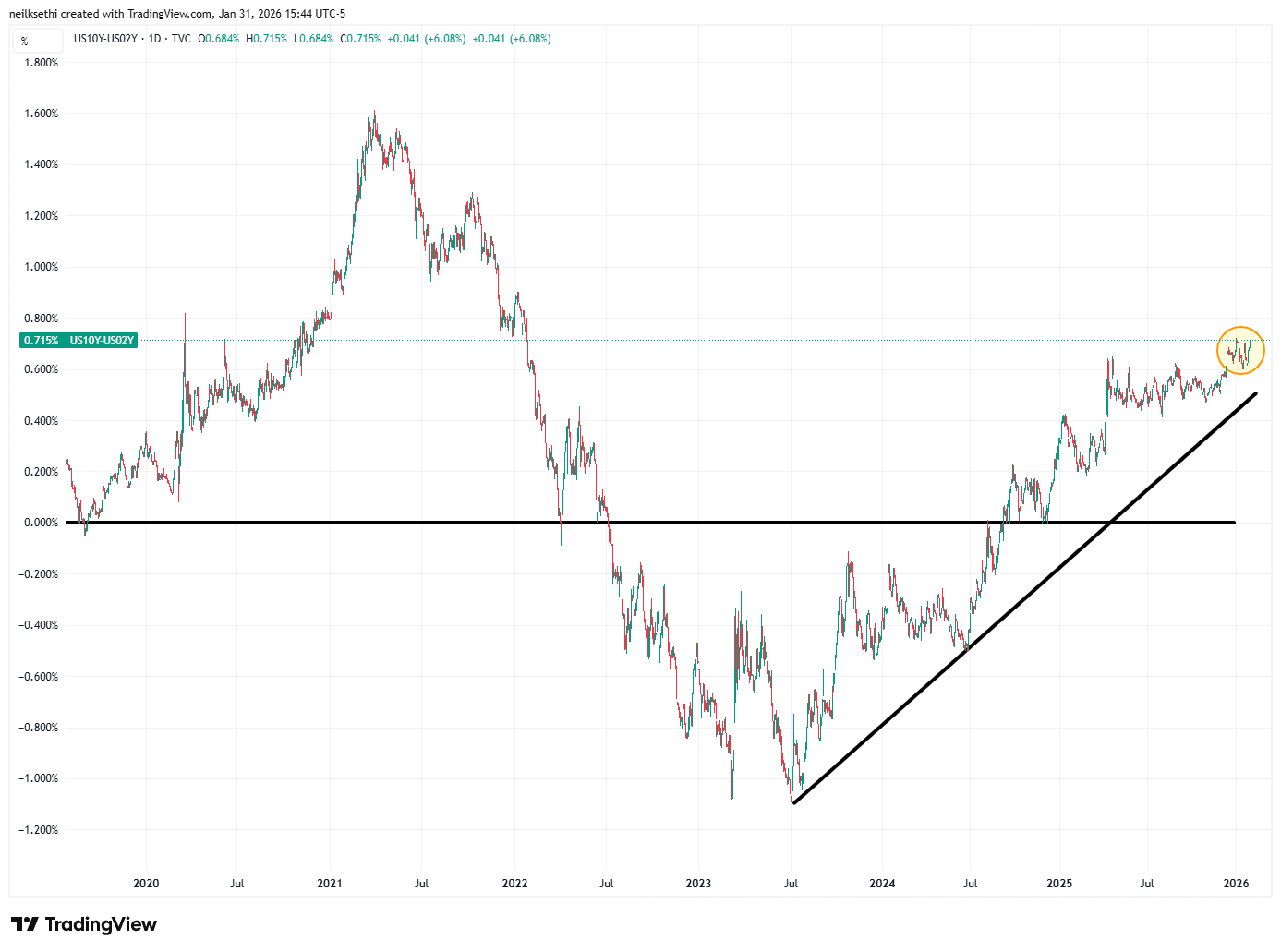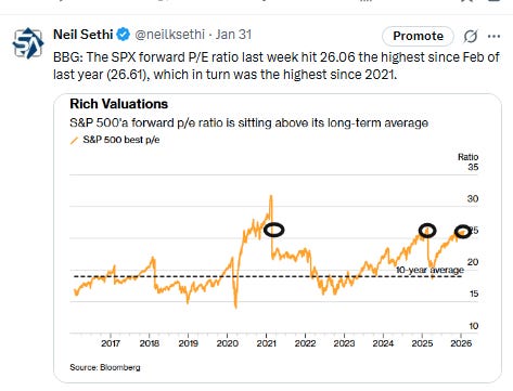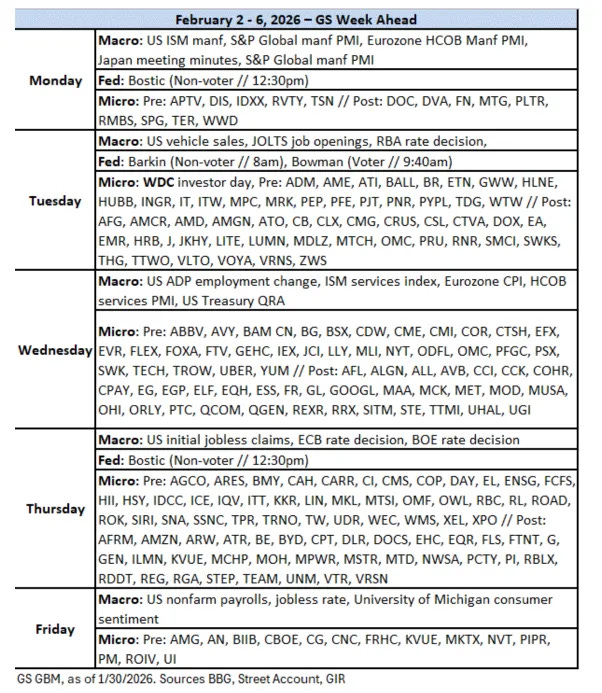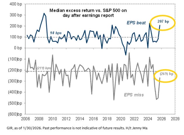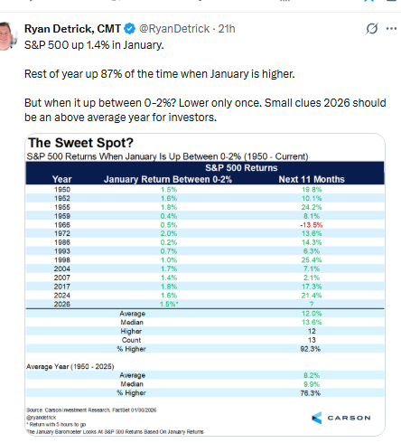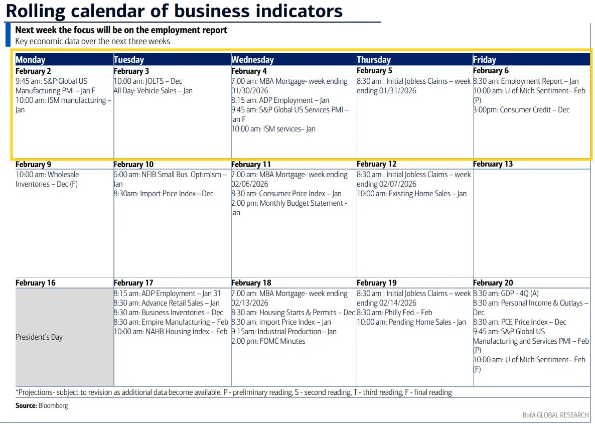 The nomination of Kevin Warsh for Fed chair has caused some moves in markets, so we’ll see how that settles out (but so far it hasn’t had much impact overall to equity or bond markets). Seasonality does turn less favorable in February, but as I always mention, it’s just a guide to what normally happens, far from something to really rely on. We’ll get another big batch of earnings this week along with the jobs data. Those clearly have the ability to move markets, so we’ll see where it takes us.