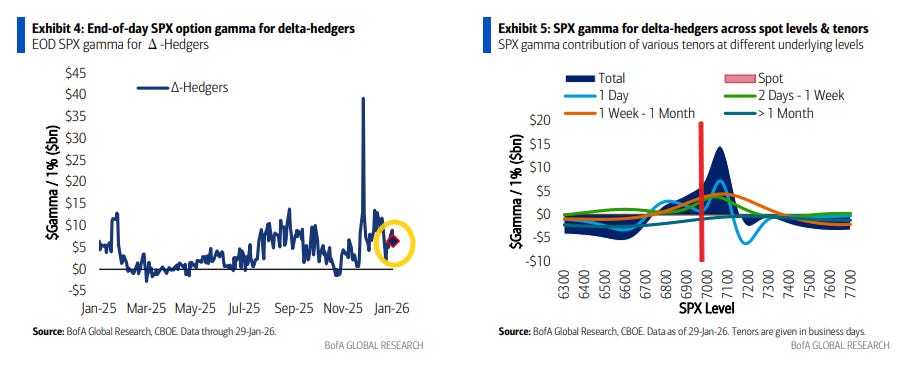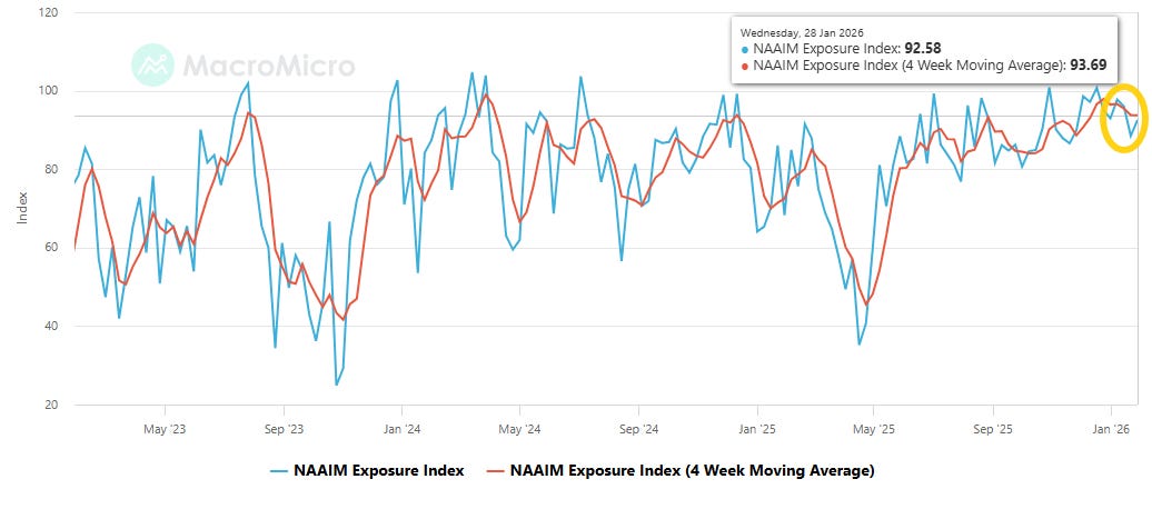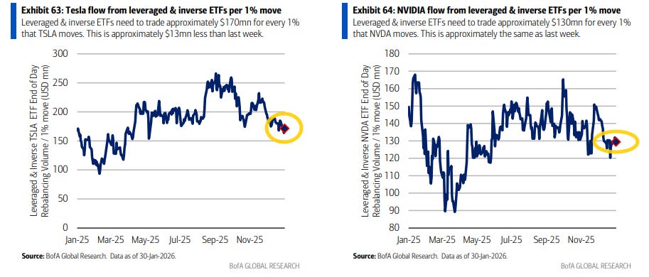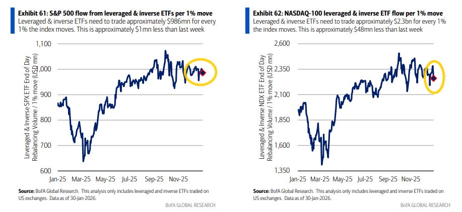 I like to look at the impact of moves in leveraged ETFs on the overall market as a barometer of risk appetite (the greater the impact, the more investors have in these ETFs which I think of as “higher risk”), and both SPX and NDX leveraged ETF AUMs fell back last week although remaining in their recent ranges and overall much closer to the highs of 2025 than the lows.