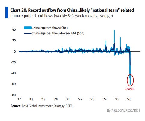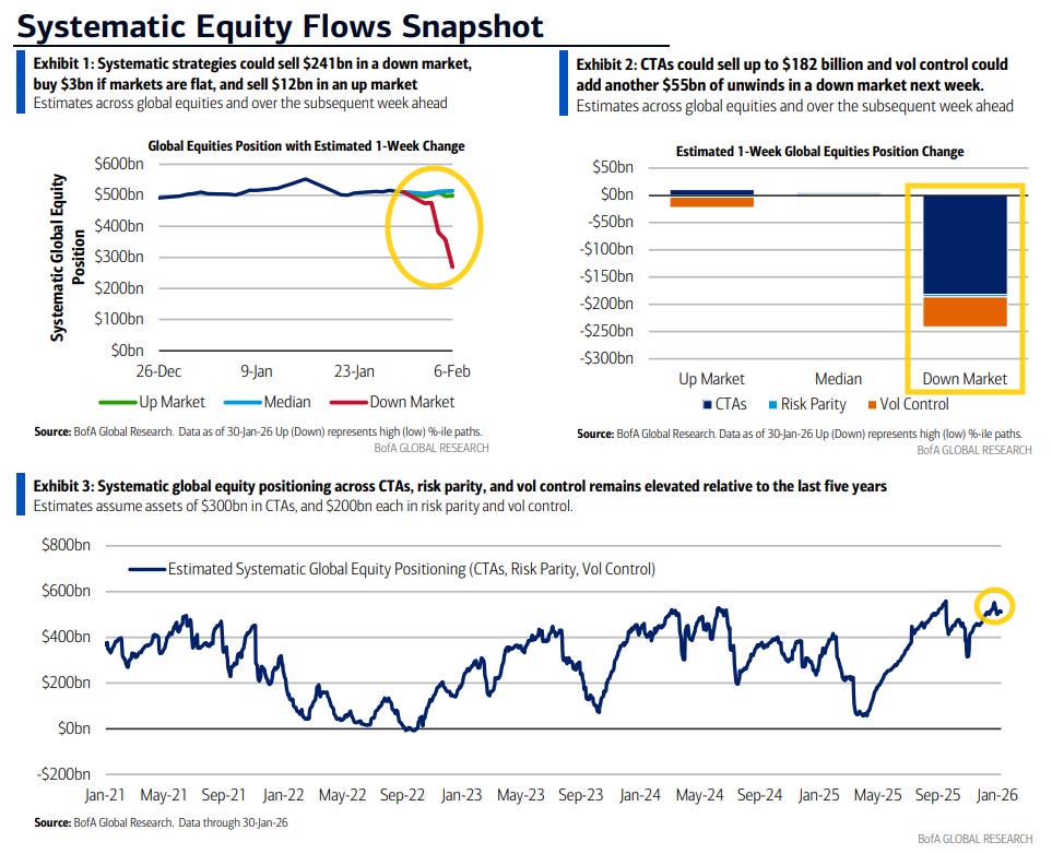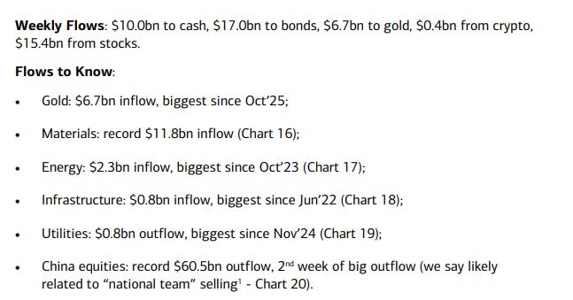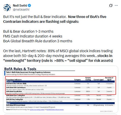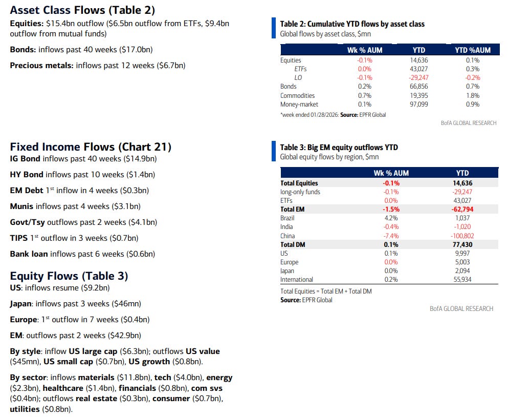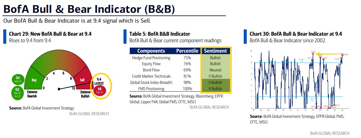 The move was “on strong global stock index breadth, long-only bull positioning (e.g., record low 3.2% FMS cash level), and robust credit market technicals, which offset global equity outflows”.