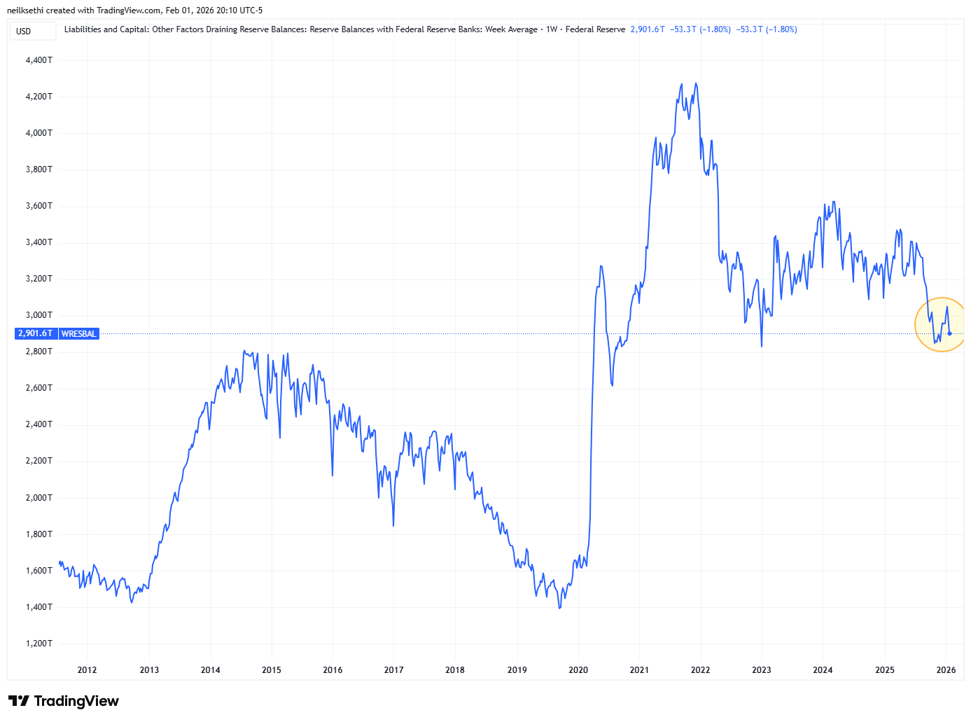 Given the FOMC reserve management purchases of $40bn a month (for the time being) added to the end of QT (as of Dec 1st), I would expect them to bounce back next week. Even at current levels though it is a level Fed members have generally indicated they are comfortable with.