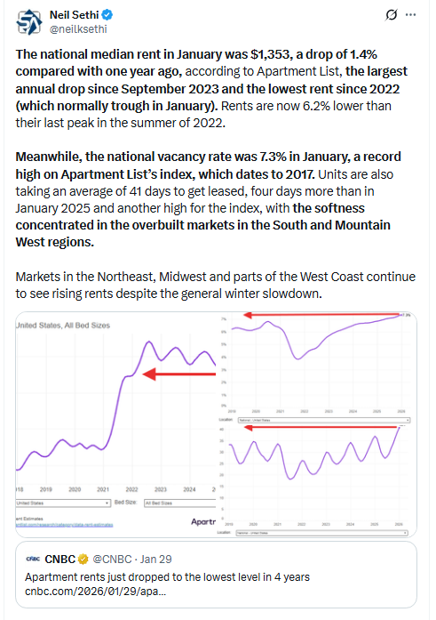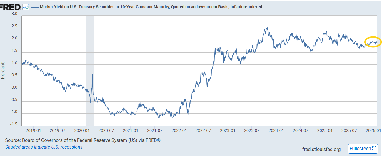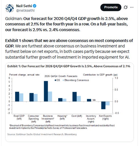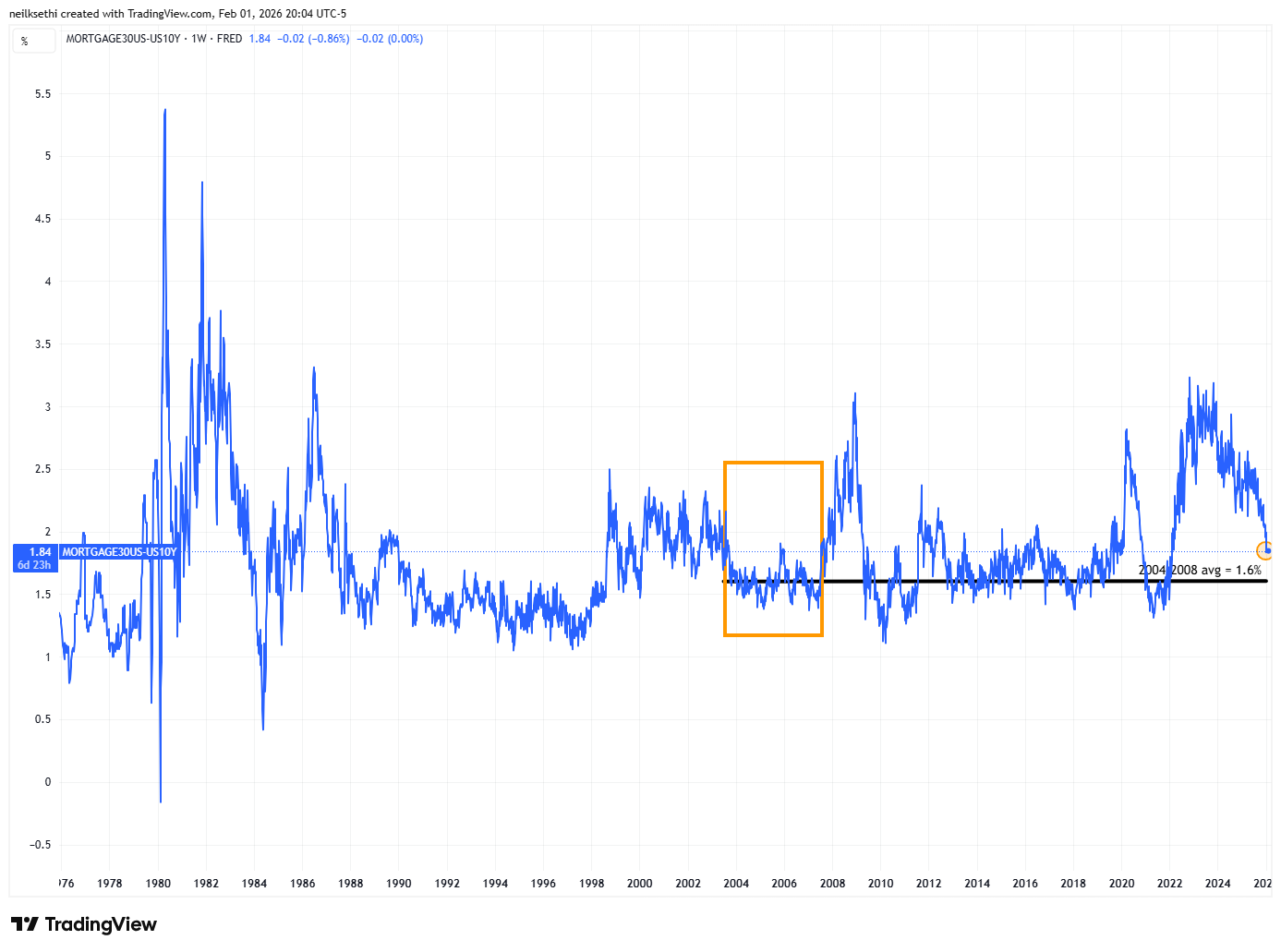 In 2025 the 10yr yield for the most part held the bottom of of my 2025 likely trading range of between 4 and 5%. As I said coming into the year, my 2026 range is 3.5 to 4.5% (with risk to the downside if the labor market continues to weaken). There is now some moderate risk to the upside if Kevin Warsh becomes the Fed chair, but allowing higher 10-year rates would be inconsistent with Pres Trump’s goal of lower mortgage rates. So we’ll see.