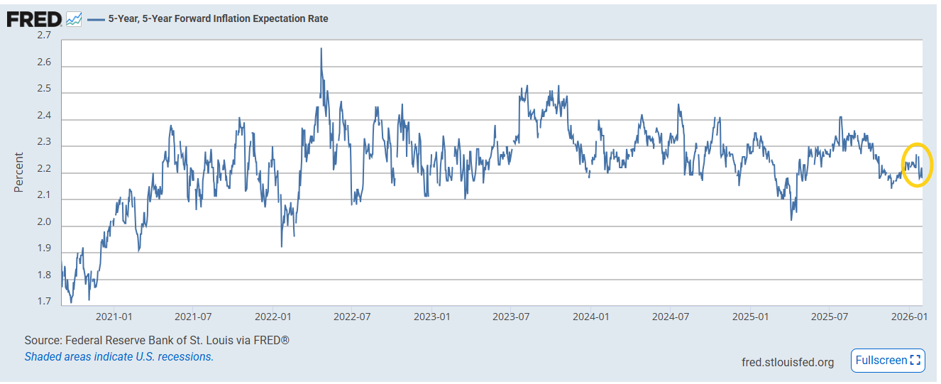 Long term inflation expectations as measured by the 5-yr, 5-yr forward rate (expected inflation starting in 5 yrs over the following 5 yrs) which had pushed up to 3-month highs at 2.27% two weeks were little changed at 2.19%. These remain in the middle of the range since 2022. They’re a touch below their 20-yr average (2.25%).