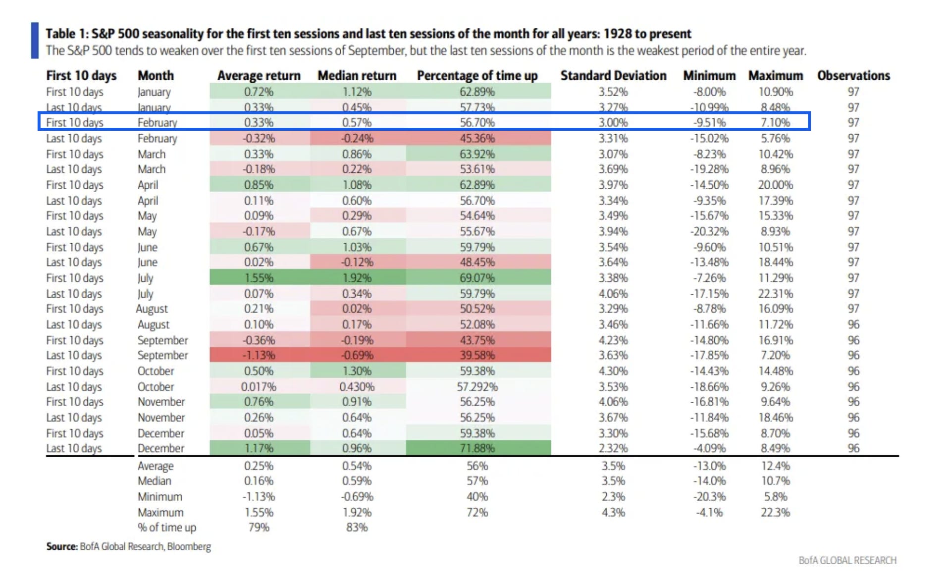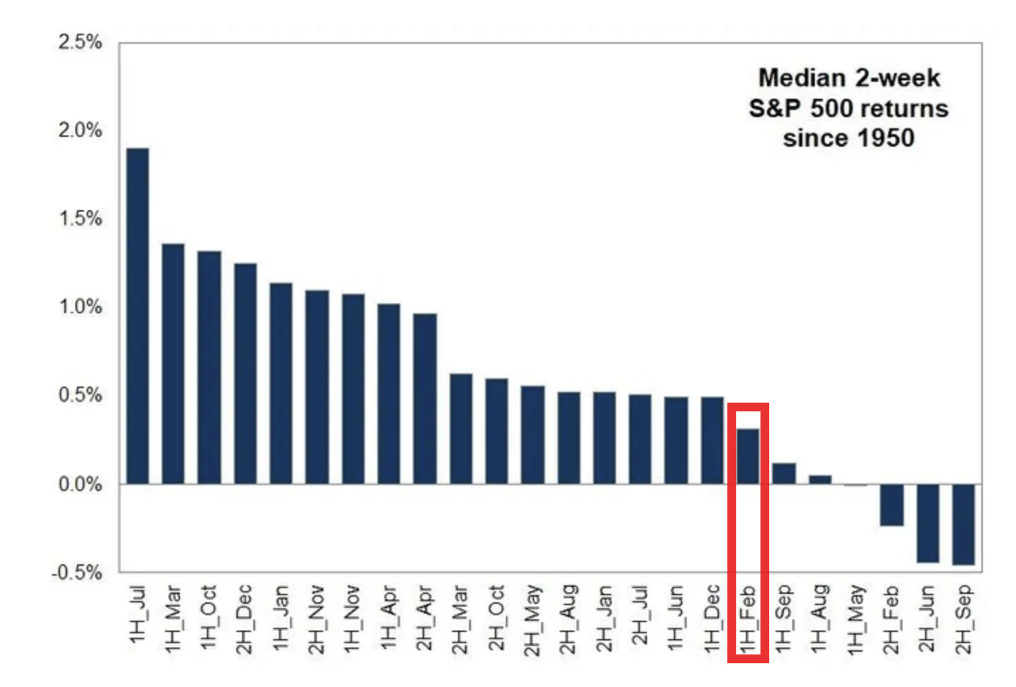 As we move into the first half of February, seasonality for all years since 1950 turns again less supportive but still positive with a median return of +0.3%, but that’s the 7th worst among all half months.