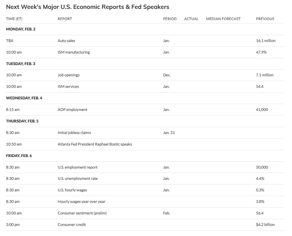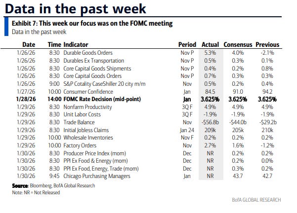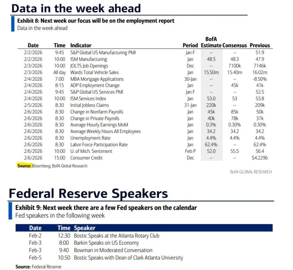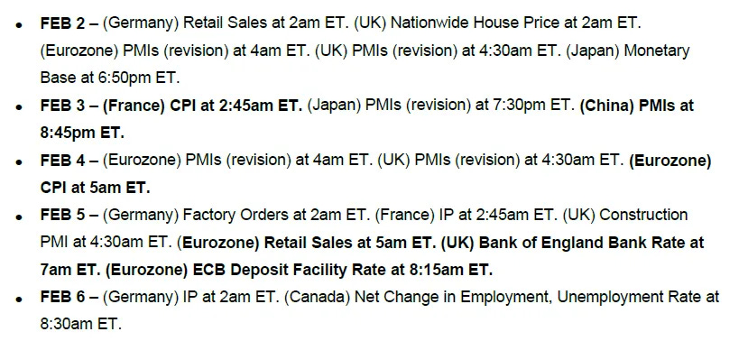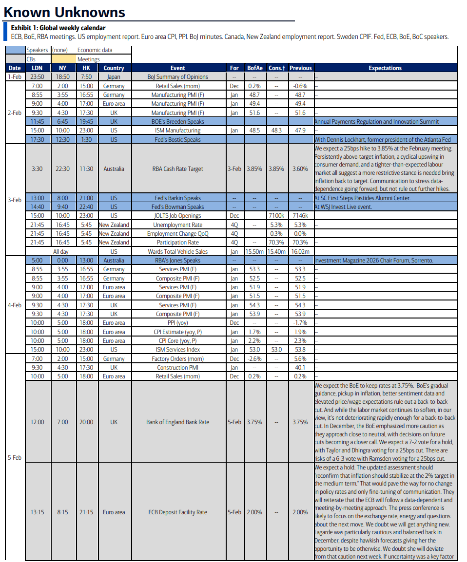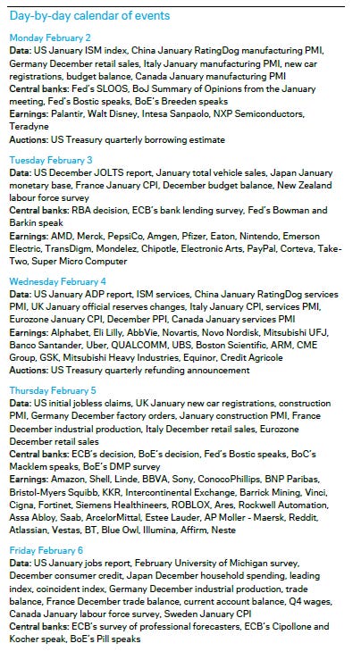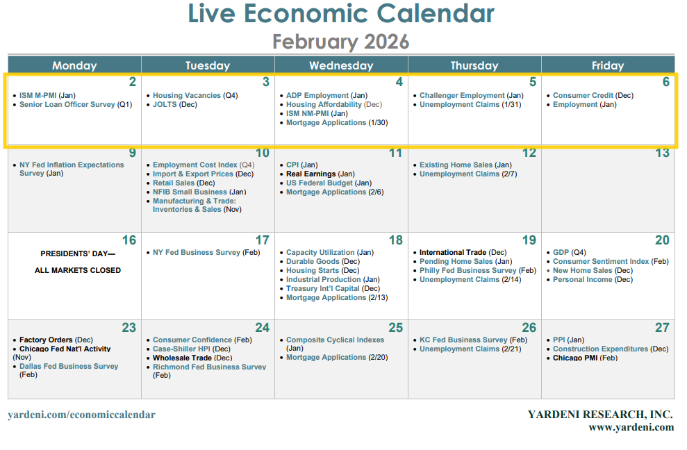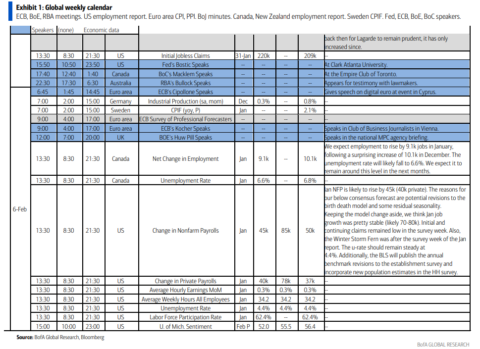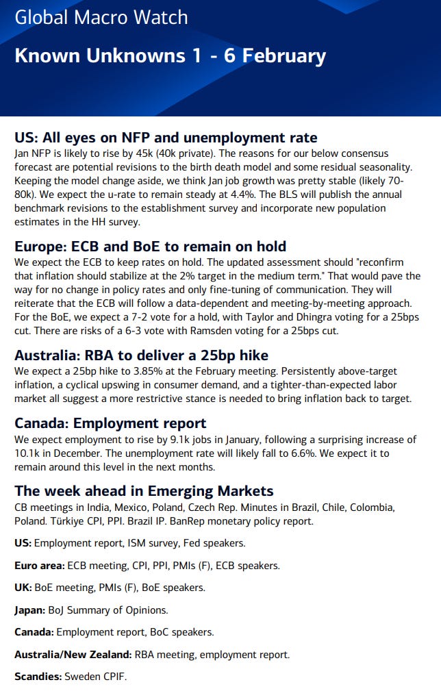 Next week is the first week of the month, and we’ll get most of our normal first week of the month US economic reports with a focus on the labor market leading up to “jobs Friday” (all assuming no shutdown). But as usual, before we make it to Friday, we’ll receive Jan ADP and Challenger job layoff/hiring announcements, Dec JOLTS, and weekly jobless claims. And, as usual, we’ll have the Jan ISM and final S&P PMIs, auto sales, and as we sometimes do, Dec consumer credit and the preliminary Feb UMich consumer survey. There’s also the Senior Loan Officer’s Survey (Mon) and the weekly mortgage applications and EIA petroleum/natgas inventories.