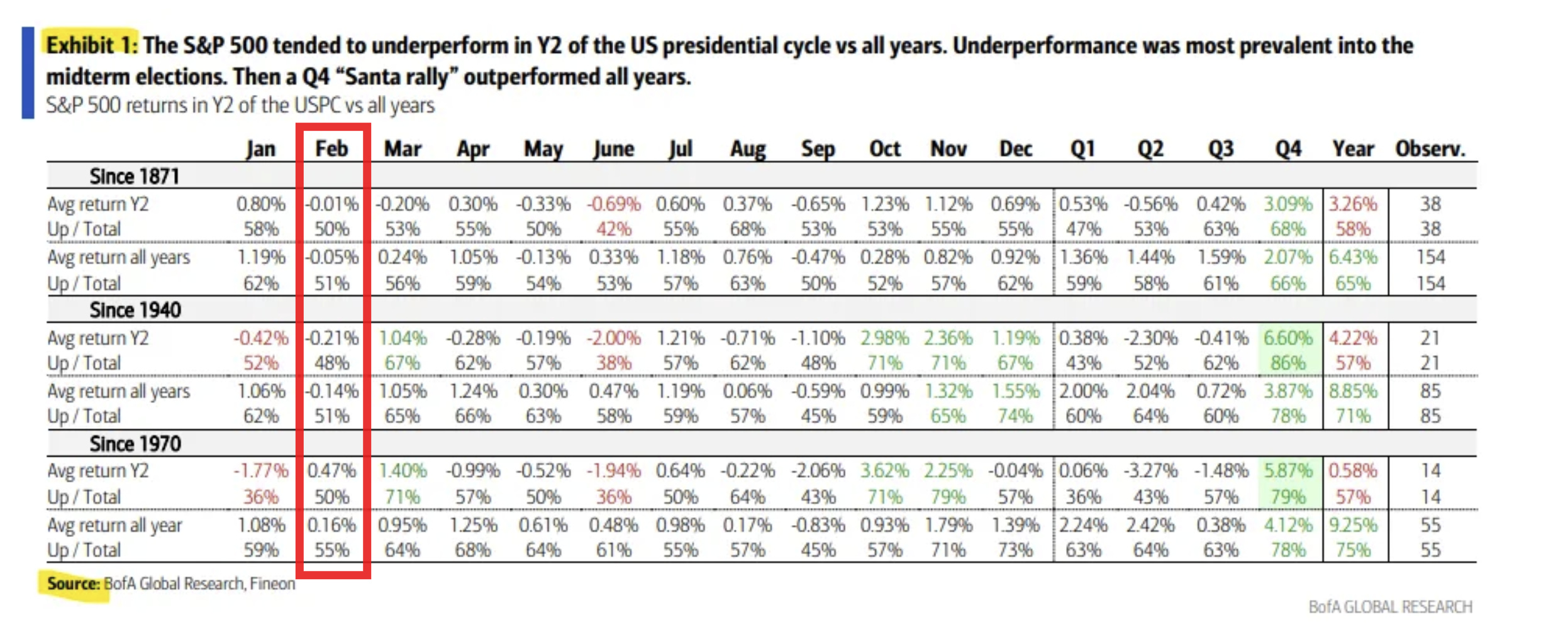 And looking specifically at Year 2 of the Presidential cycle, since 1940 February has been up 48% of the time with an average gain of -0.21% (vs 51% and -0.14% for all year), but if we zoom in on since 1970, it’s been up 50% of the time with an average gain of +0.47% (vs 55% and +0.16% for all years).