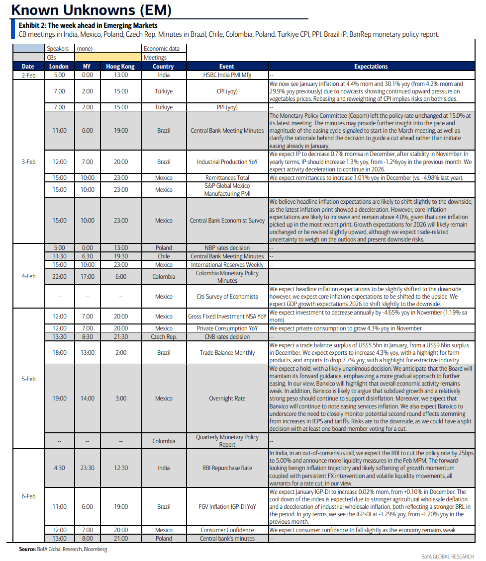 As if on cue, Chile’s January consumer prices report may see inflation actually drop below the 3% target while the minutes of the central bank’s dovish rate hold in December may help pin down the timing of the next cut. In LatAm’s No. 2 economy, Mexico’s central bank has done a fairly thorough job of telegraphing clear intent to pause a 12-meeting, 400 basis-point easing cycle at Thursday’s rate decision. Slack in the economy is a concern, though potentially volatile US trade policies and an upcoming review of Mexico’s free trade accord with the US and Canada argue for some caution.